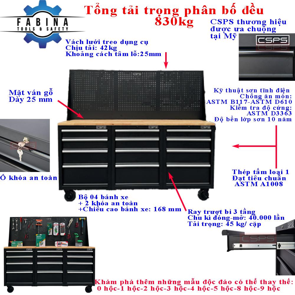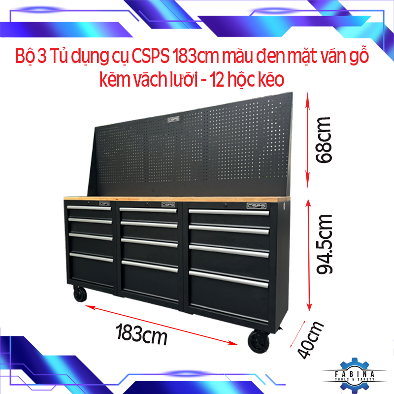 Set of 3 CSPS 183cm black tool cabinets with wooden panel and mesh wall - 12 drawers (white handle)