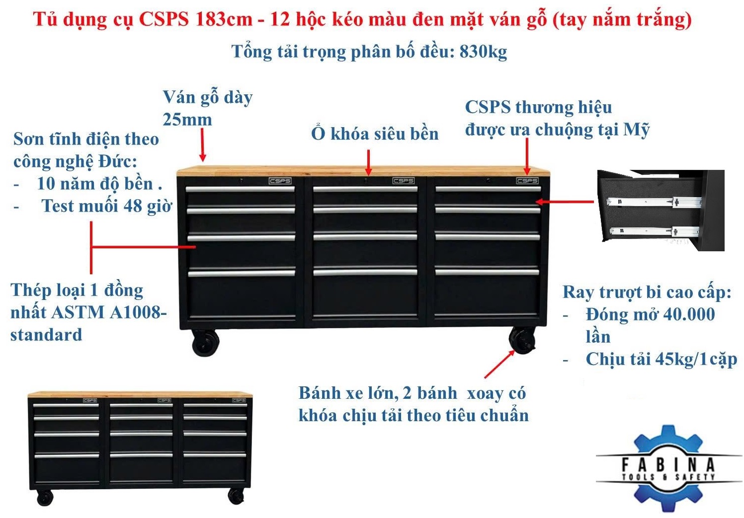 Set of 3 CSPS 183cm black tool cabinets with wooden panel - 12 drawers (white handle)