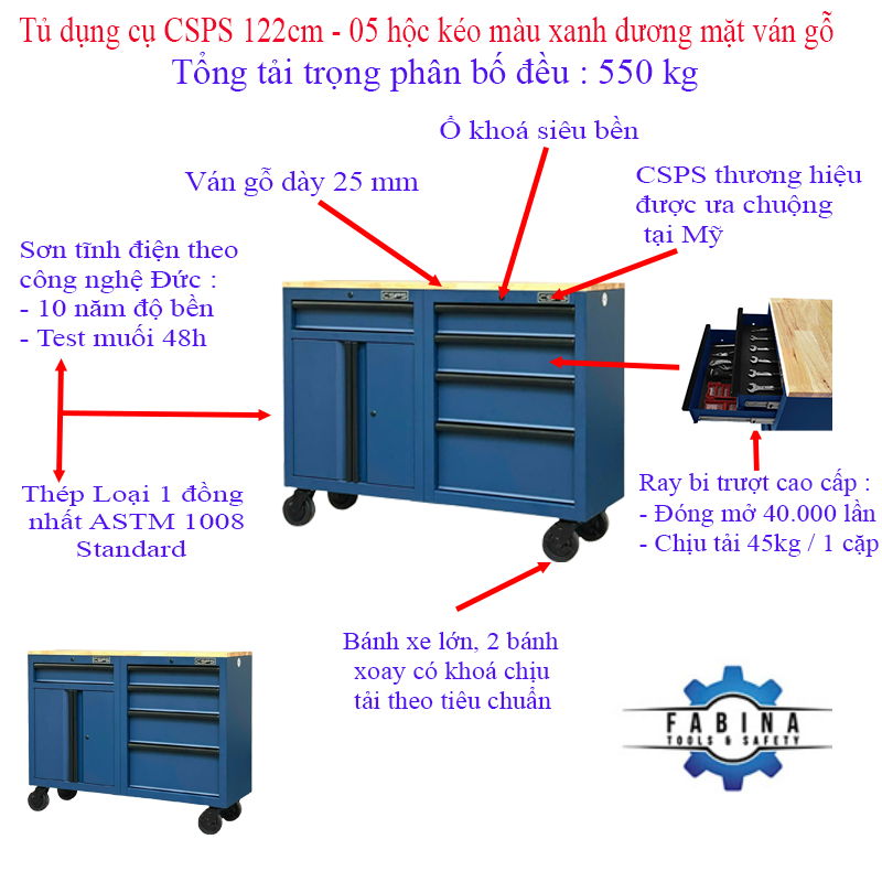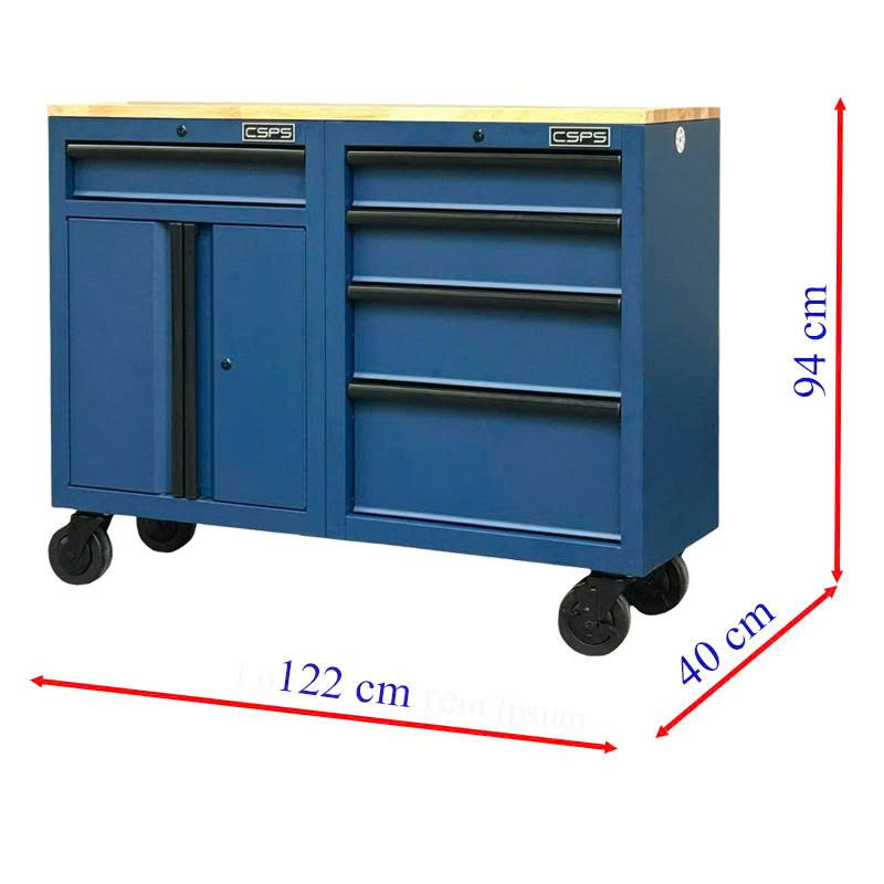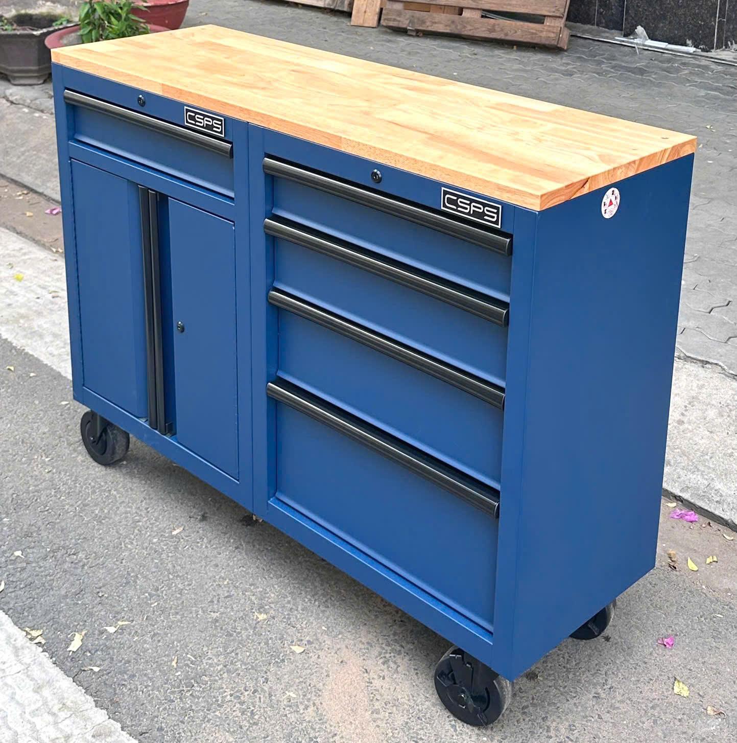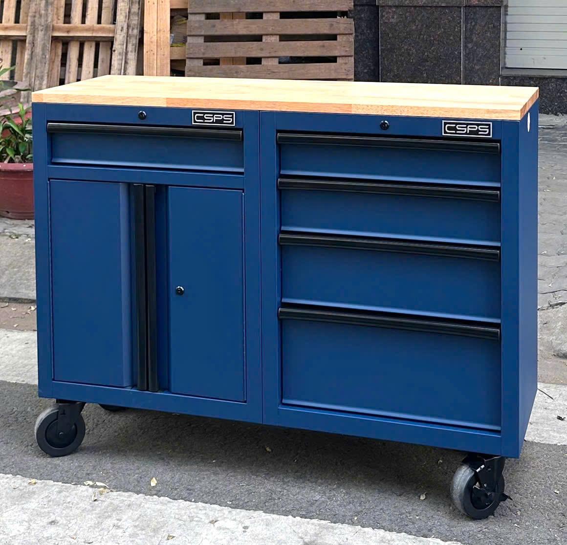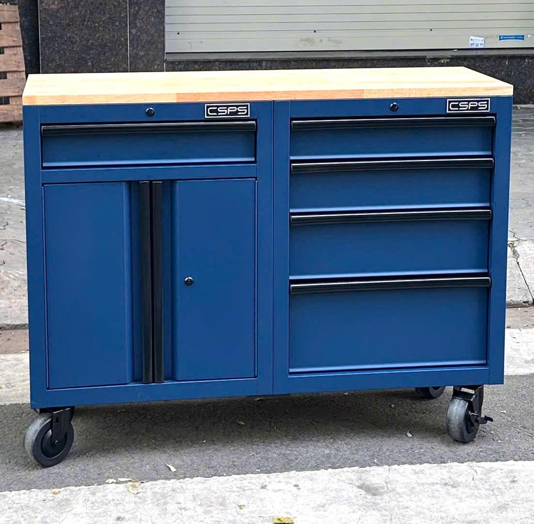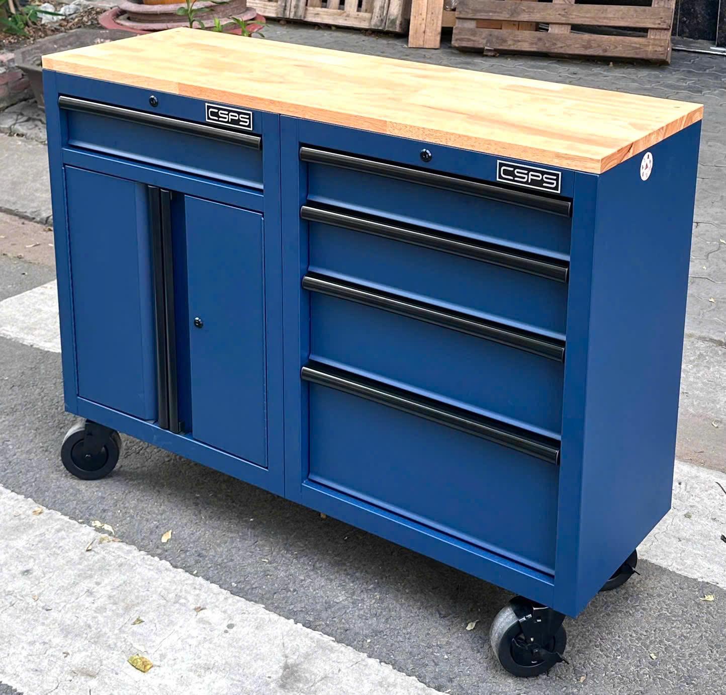 Set of 2 CSPS 122cm blue tool cabinets with wooden top - 05 drawers