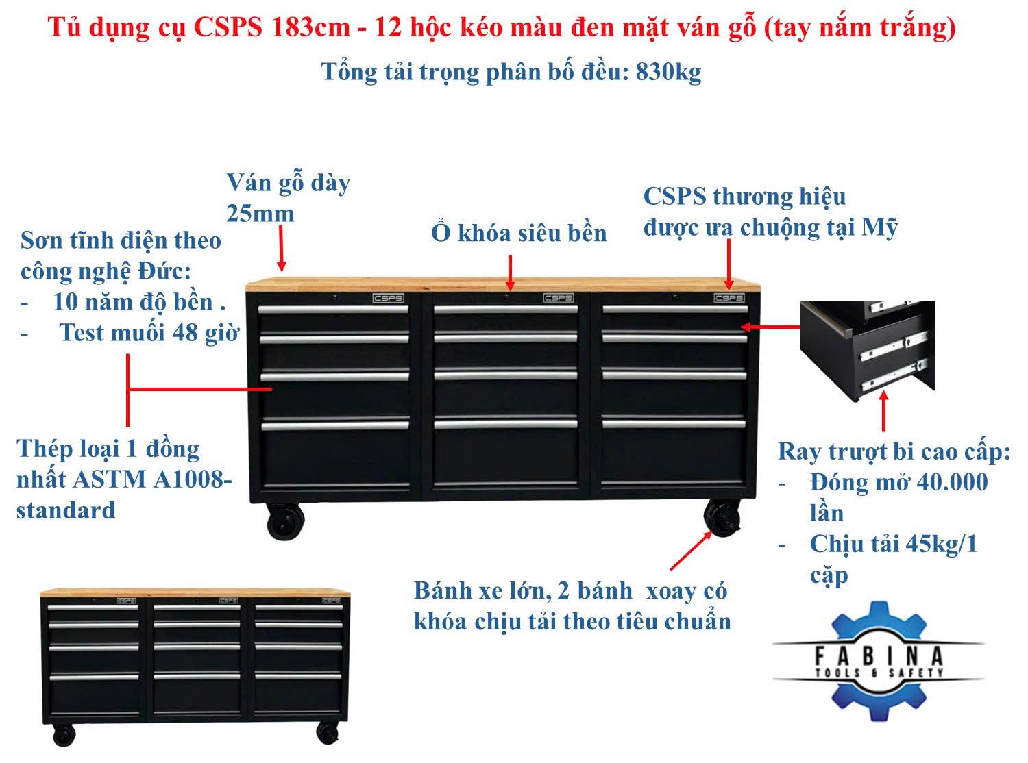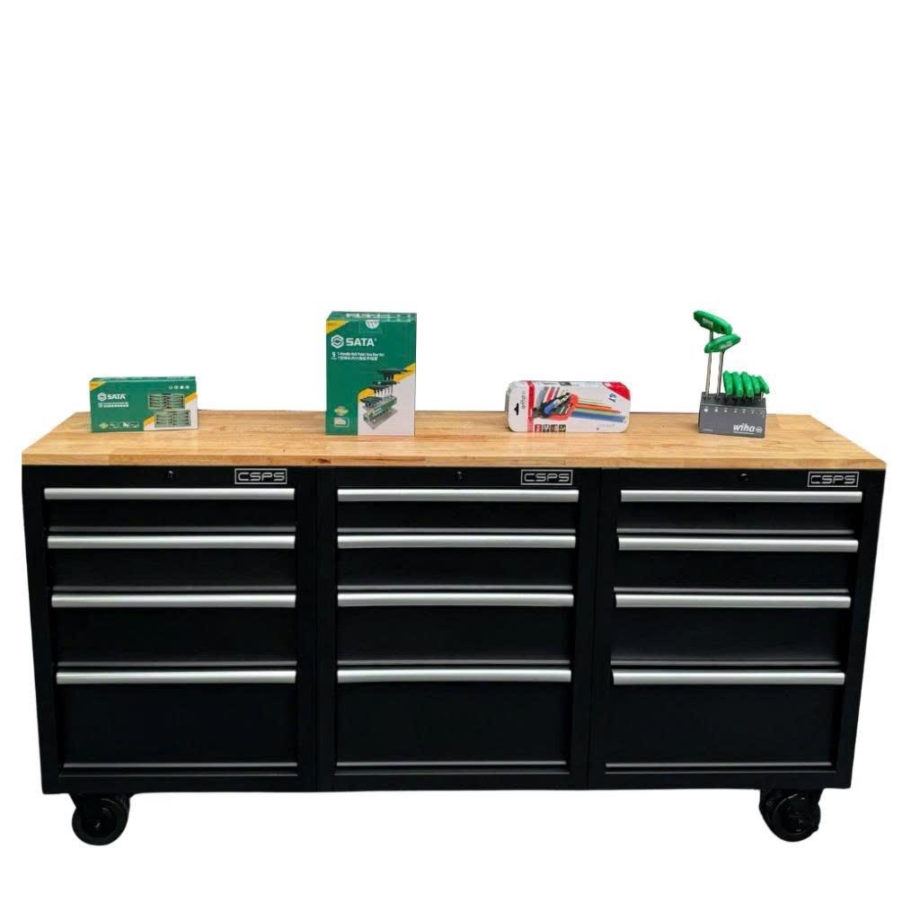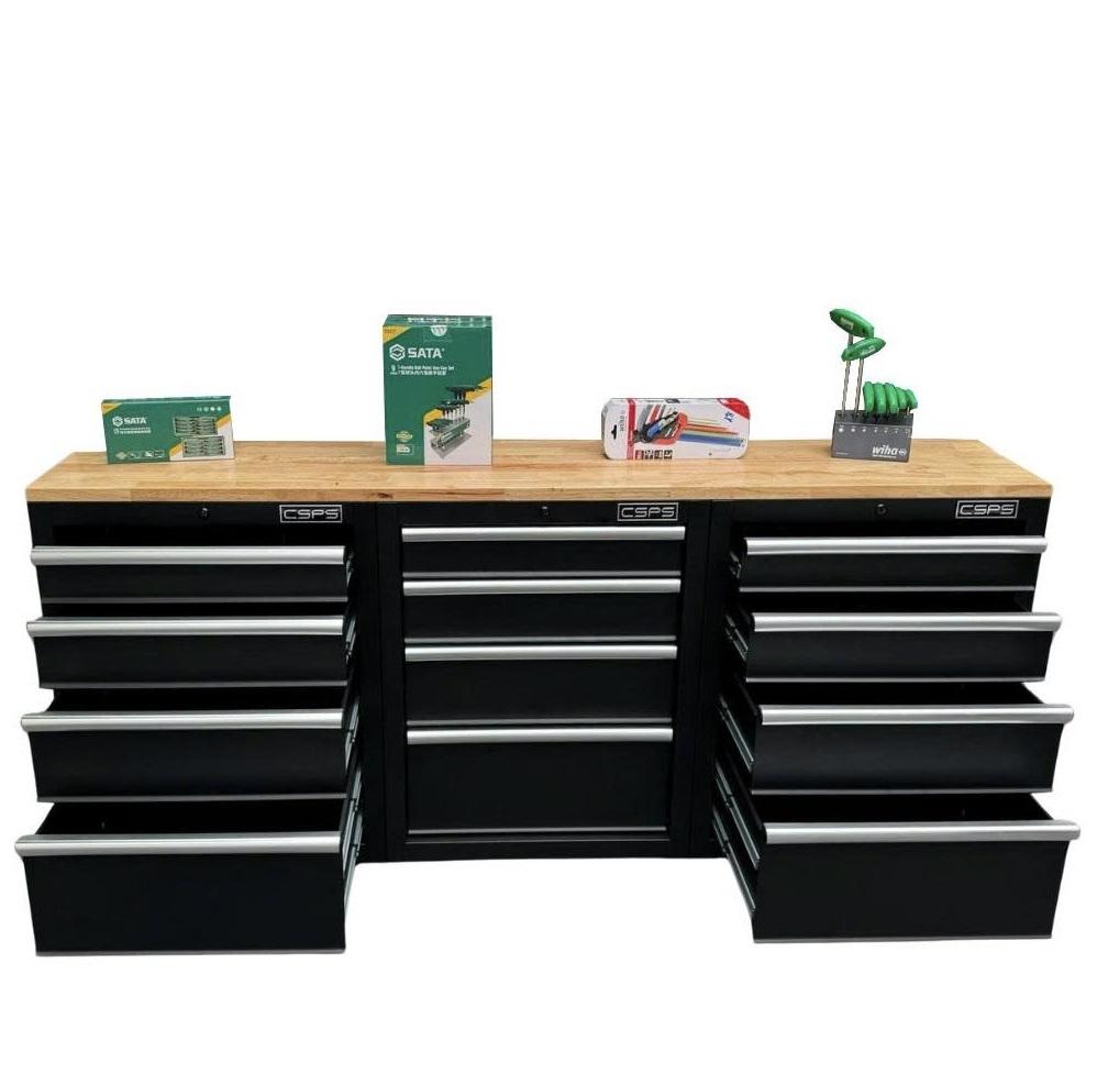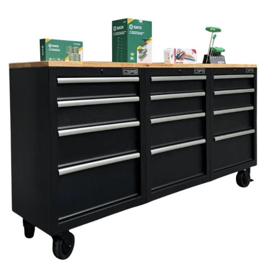 Tủ dụng cụ CSPS 183cm - 12 hộc kéo màu đen mặt ván gỗ (tay cầm trắng)