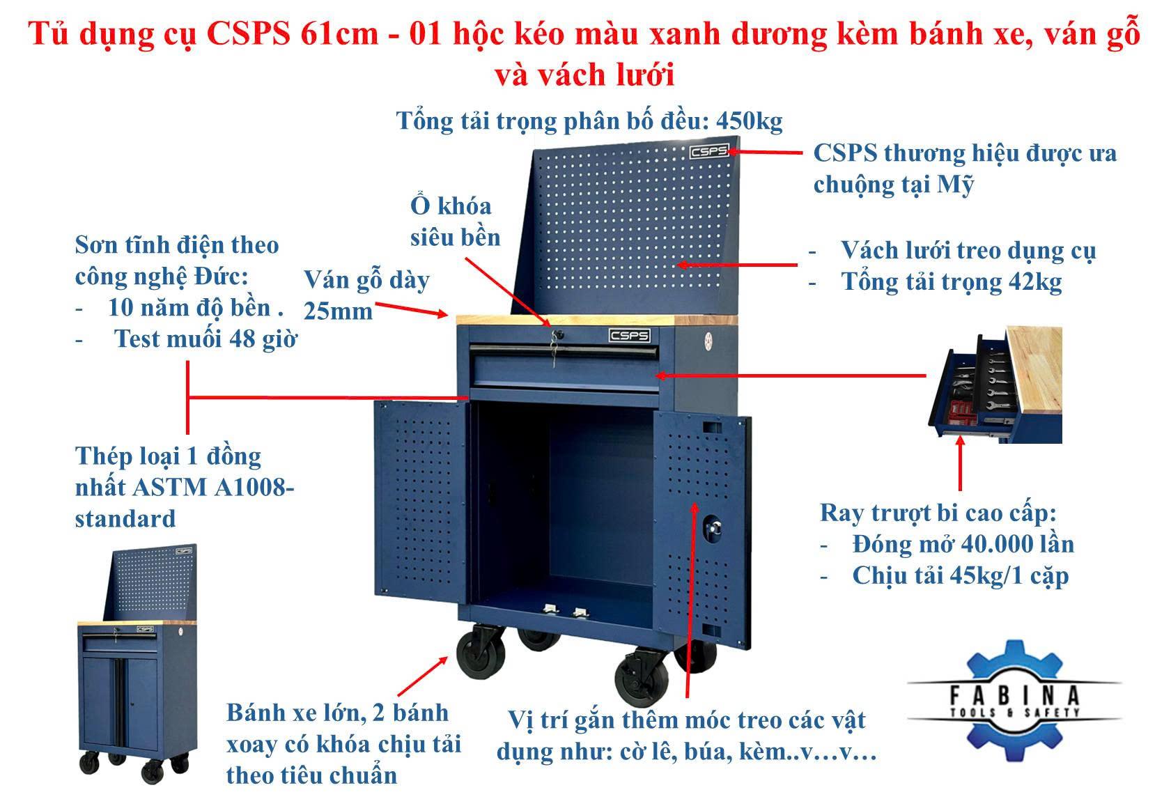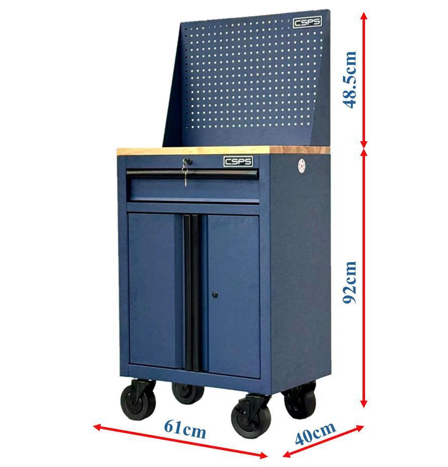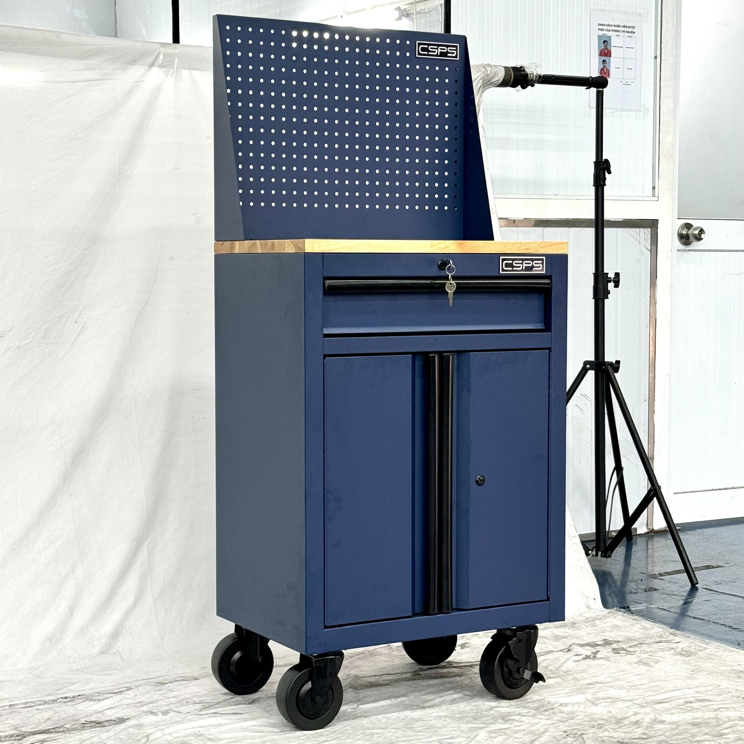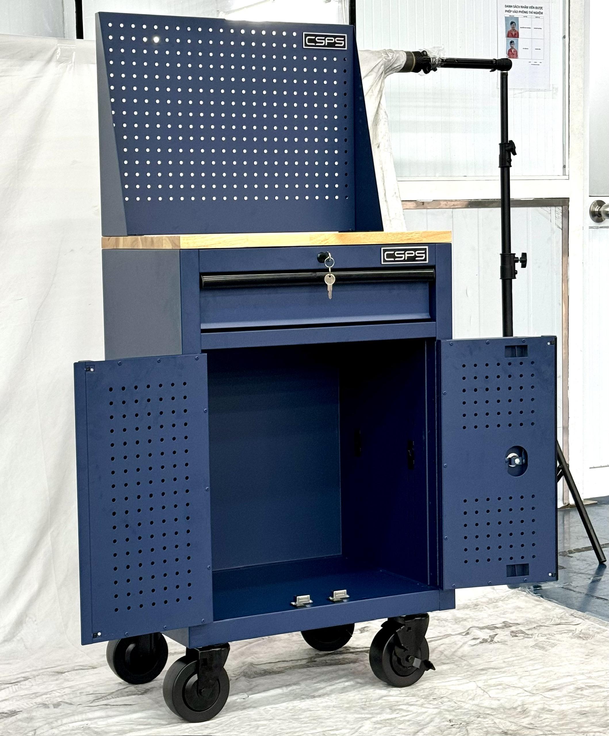 Tủ dụng cụ CSPS 61cm - 01 hộc kéo màu xanh dương kèm bánh xe, ván gỗ và vách lưới