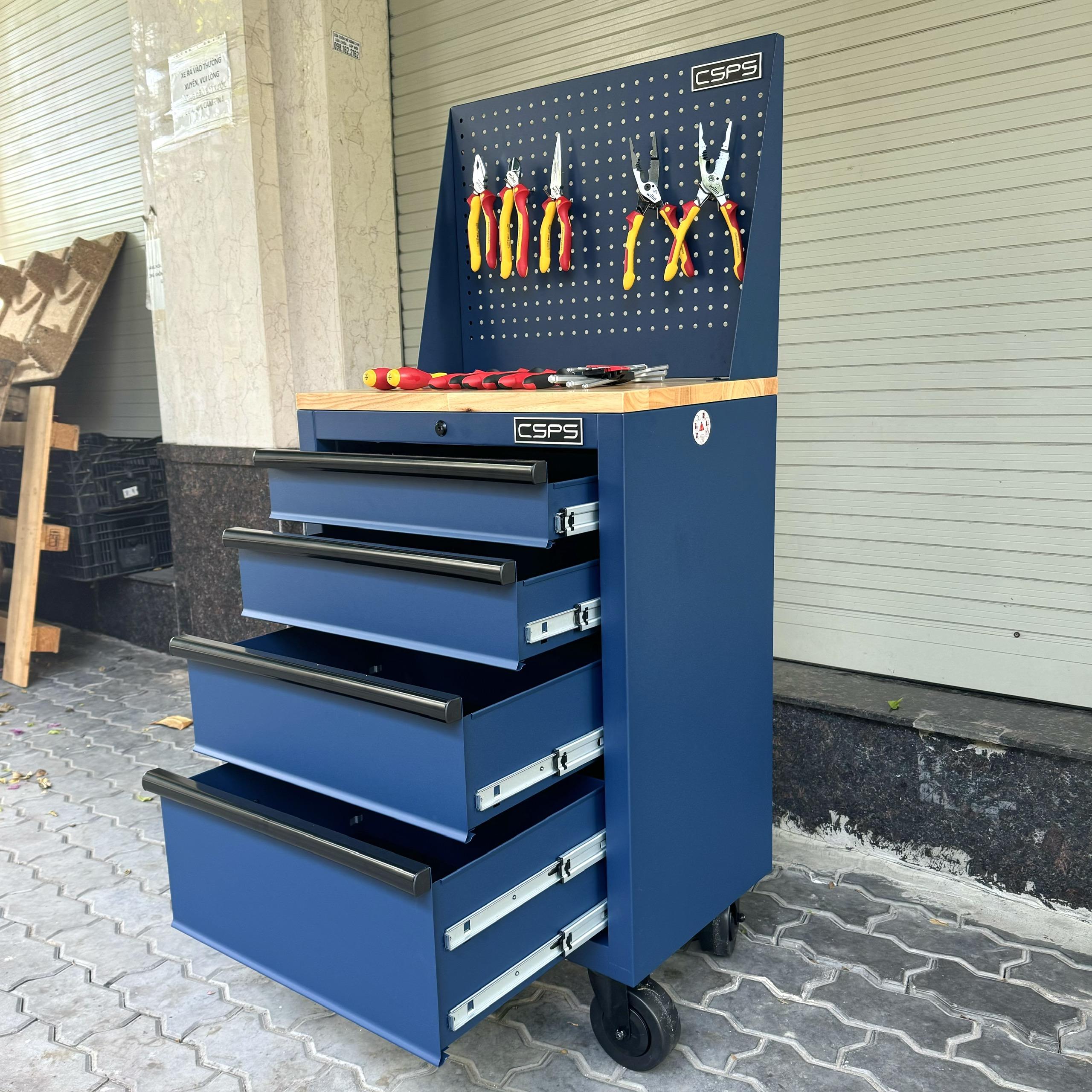 Tủ dụng cụ CSPS 61cm - 04 hộc kéo màu xanh dương kèm bánh xe ván gỗ vách lưới