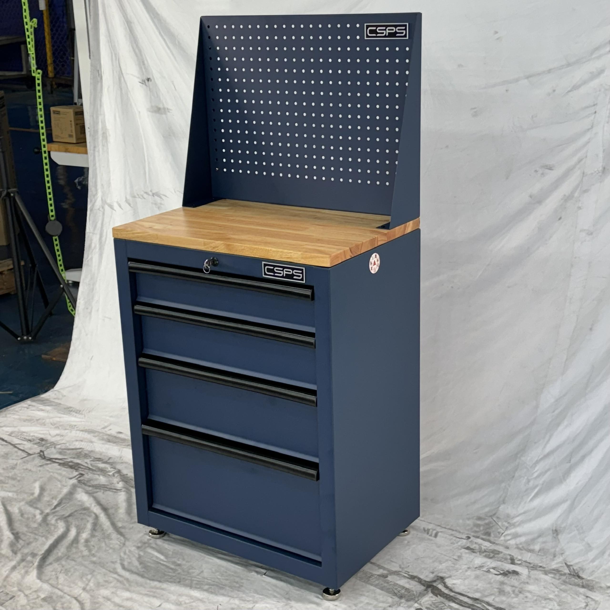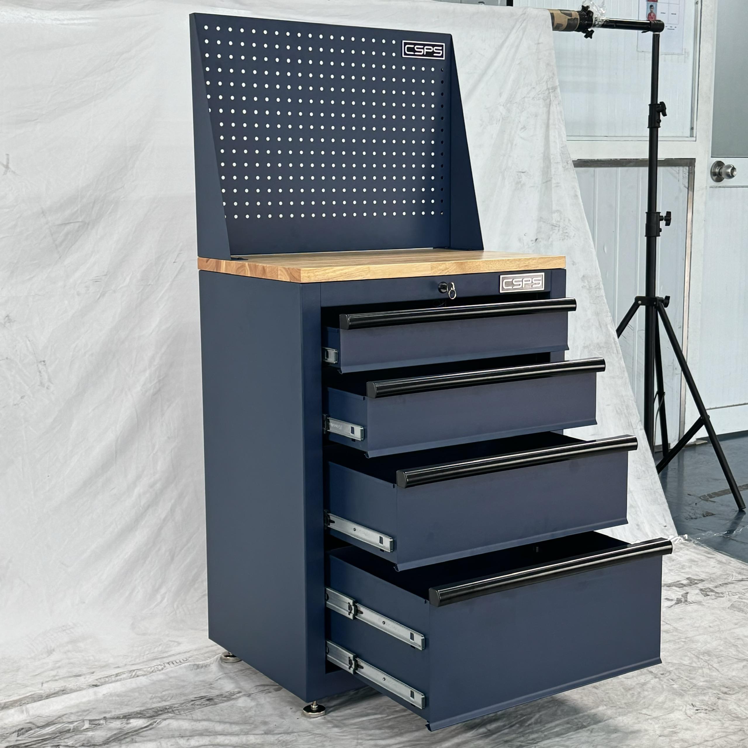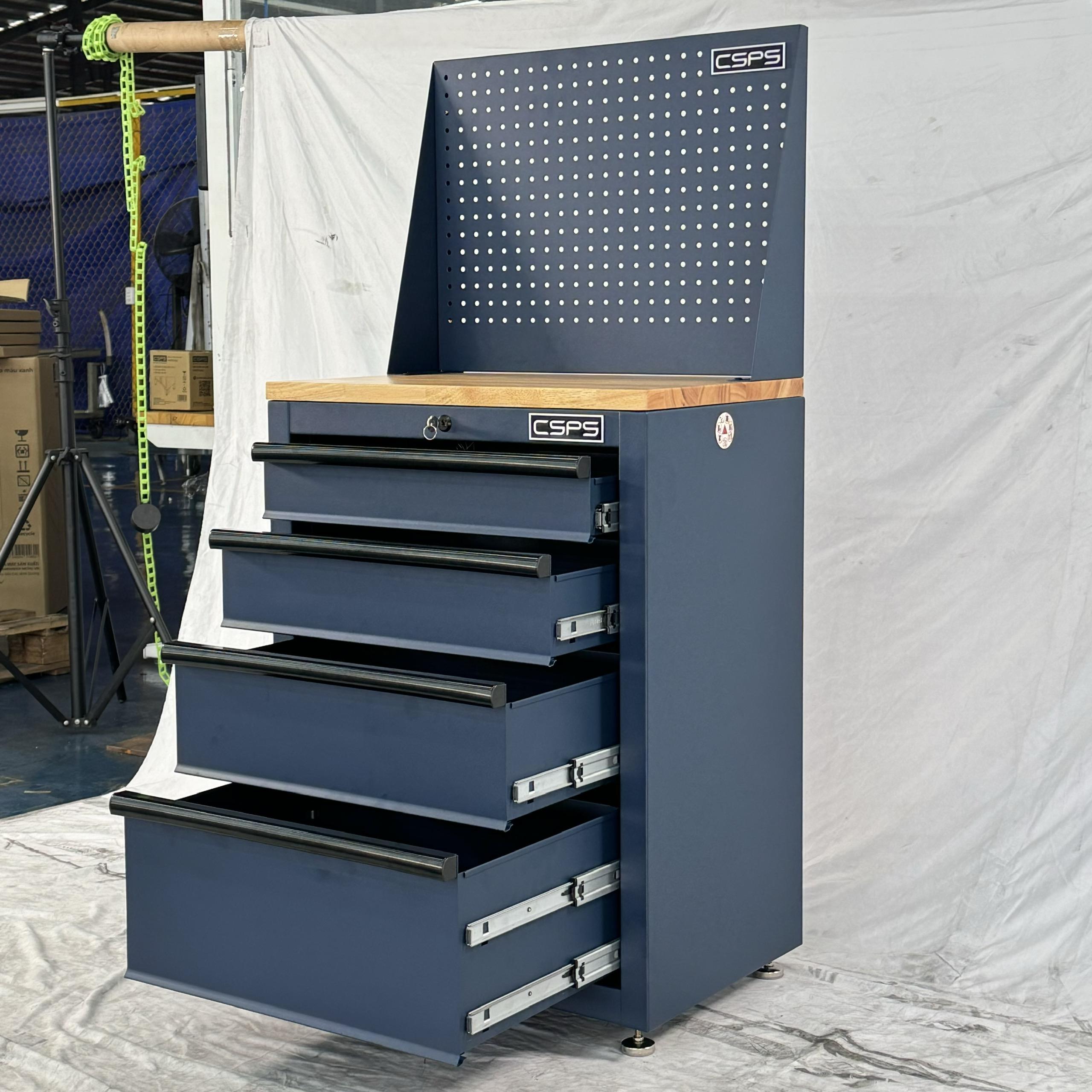 Tủ dụng cụ CSPS 61cm - 04 hộc kéo màu xanh dương kèm vách lưới ván gỗ kèm chân tăng chỉnh