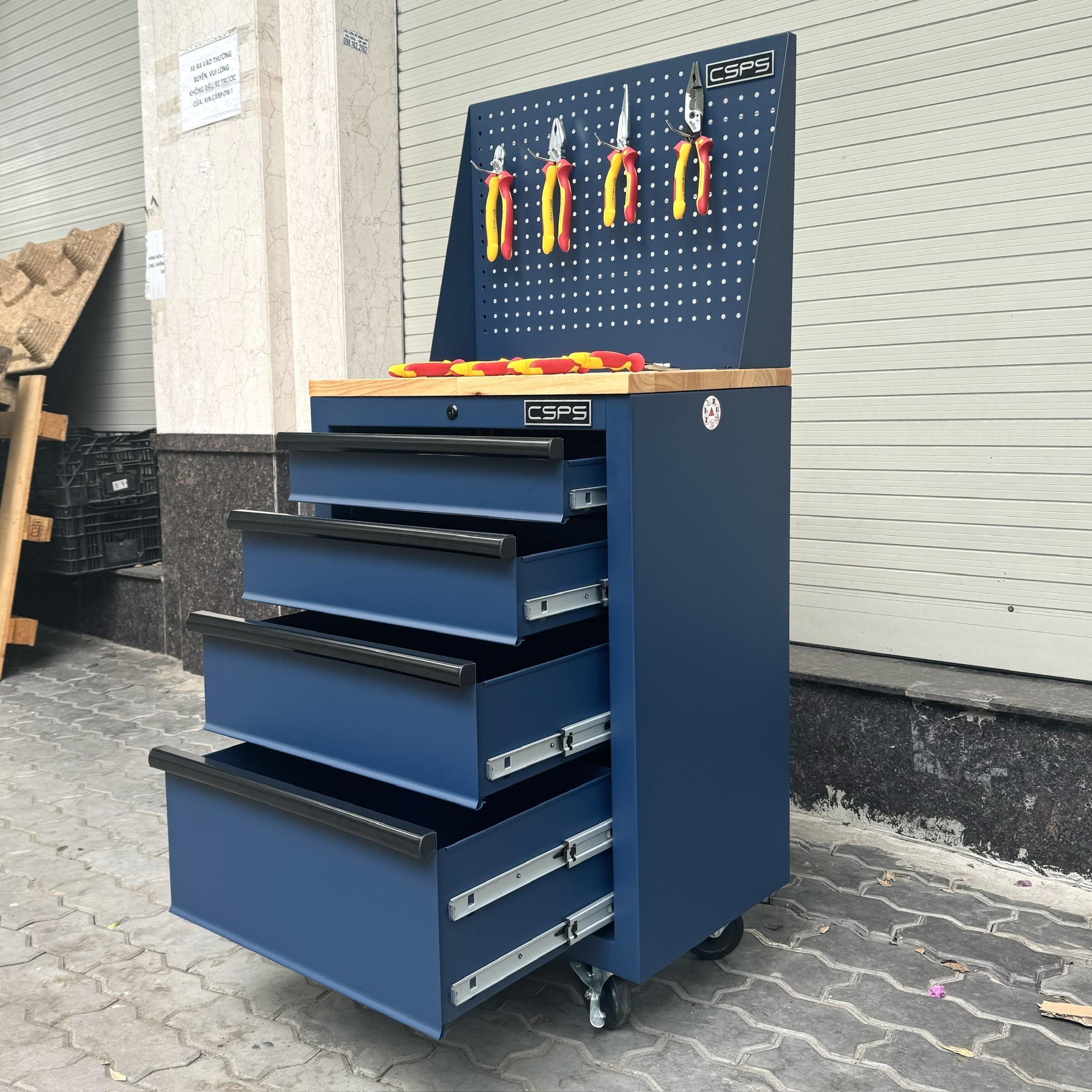 Tủ dụng cụ CSPS 61cm - 04 hộc kéo màu xanh dương mặt ván gỗ vách lưới kèm bánh xe Fbn 12cm
