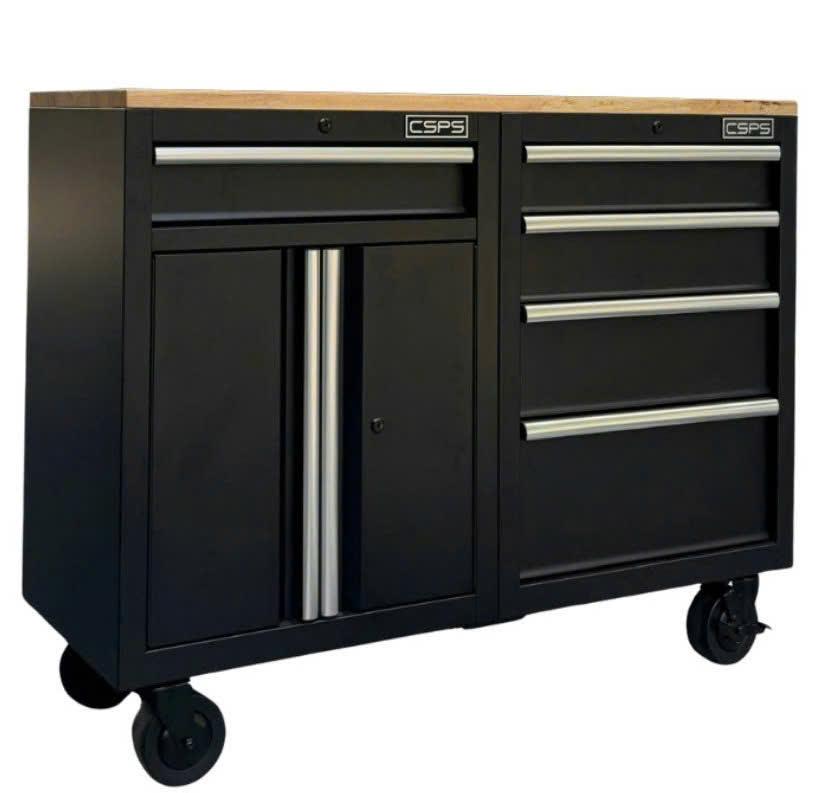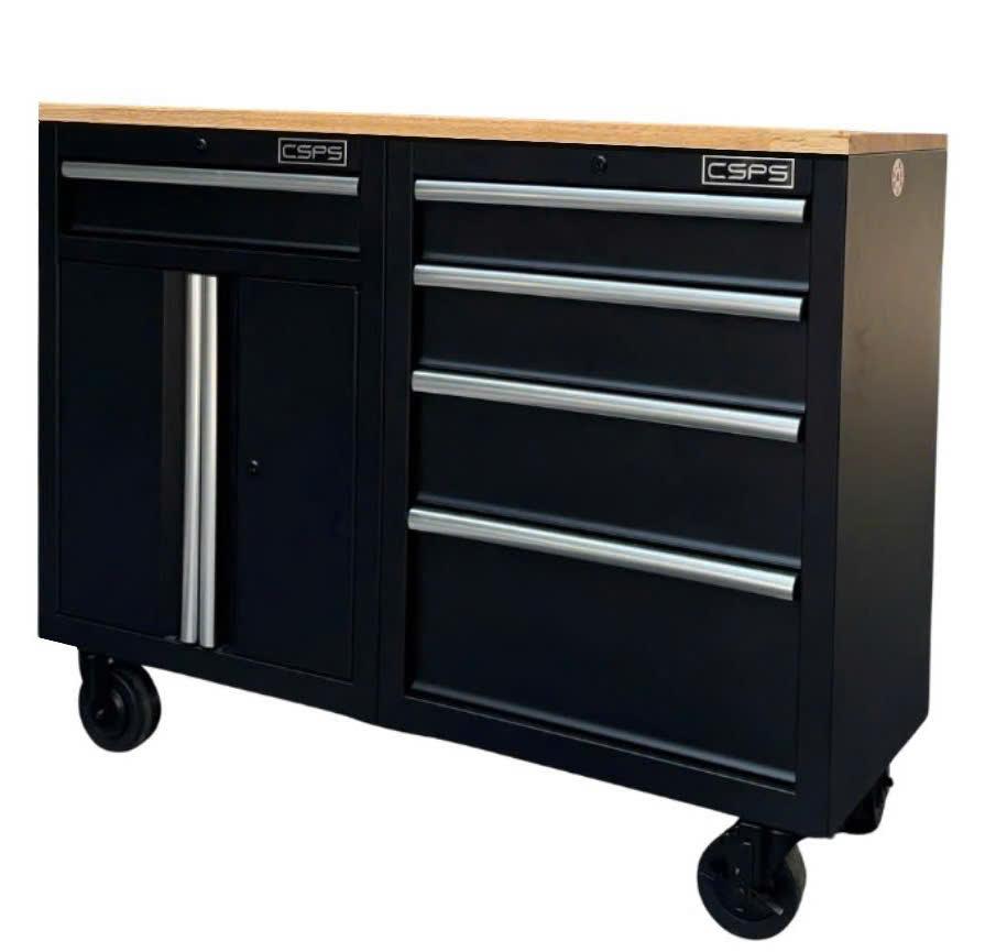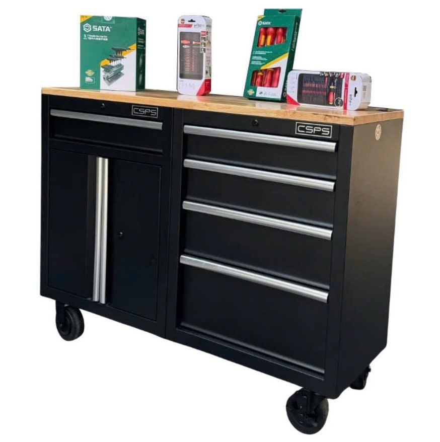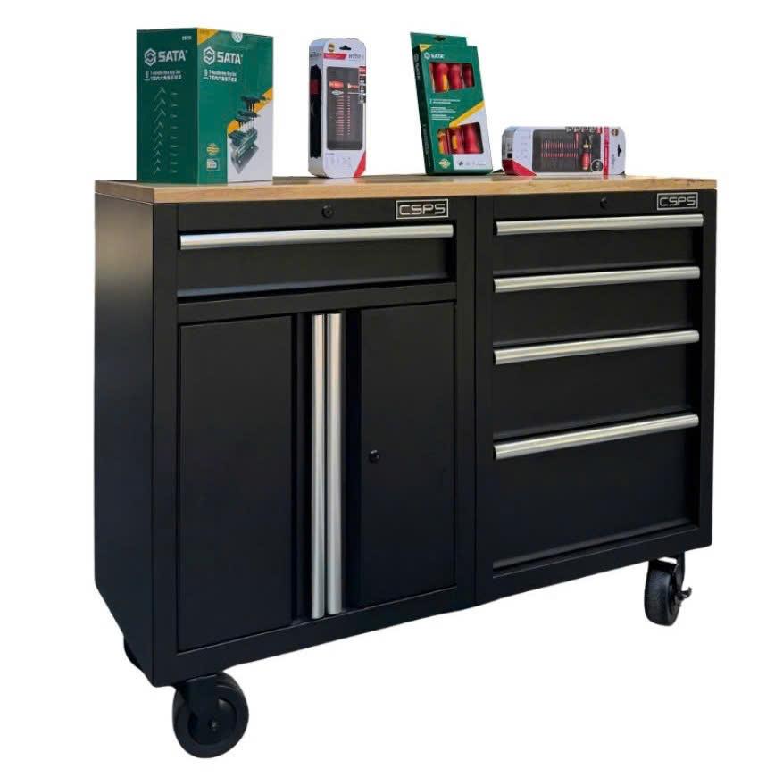 Tủ dụng cụ CSPS 122cm - 05 hộc kéo màu đen mặt ván gỗ (tay nắm trắng)