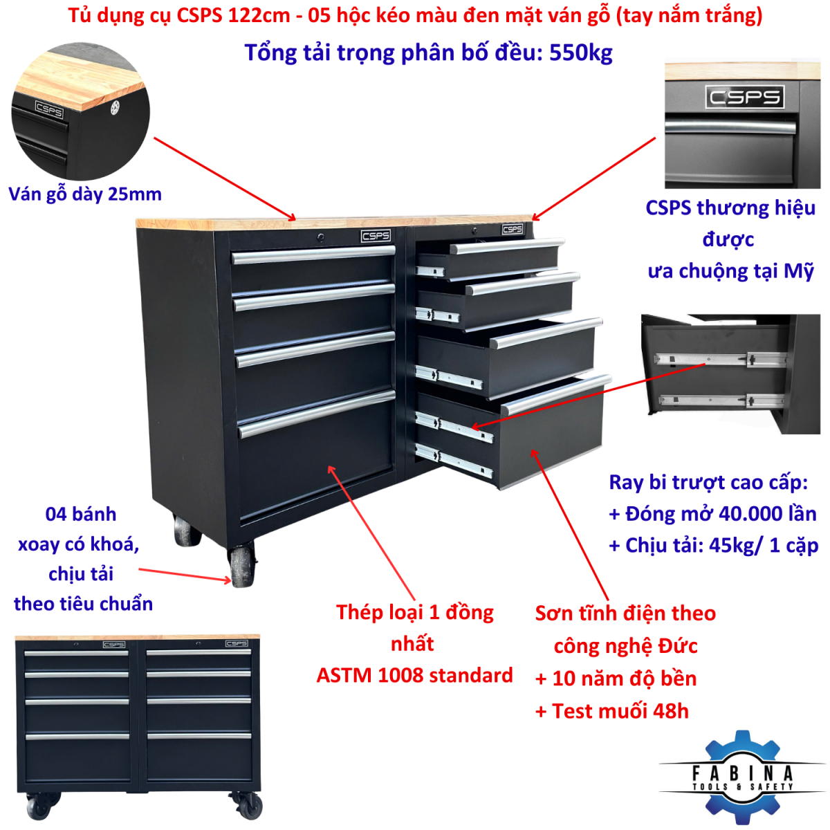 Tủ dụng cụ CSPS 122cm - 08 hộc kéo màu đen tay cầm trắng mặt ván gỗ