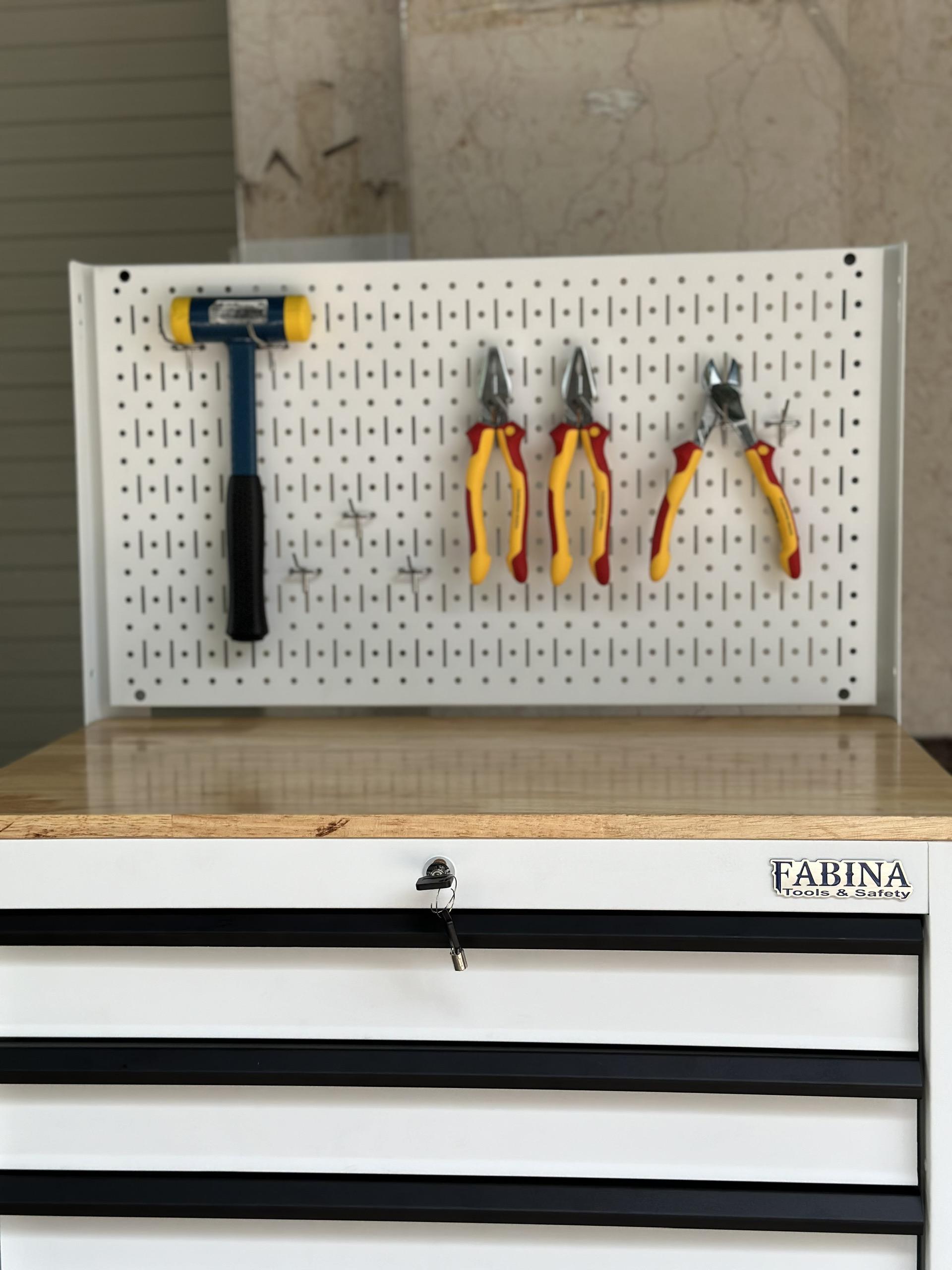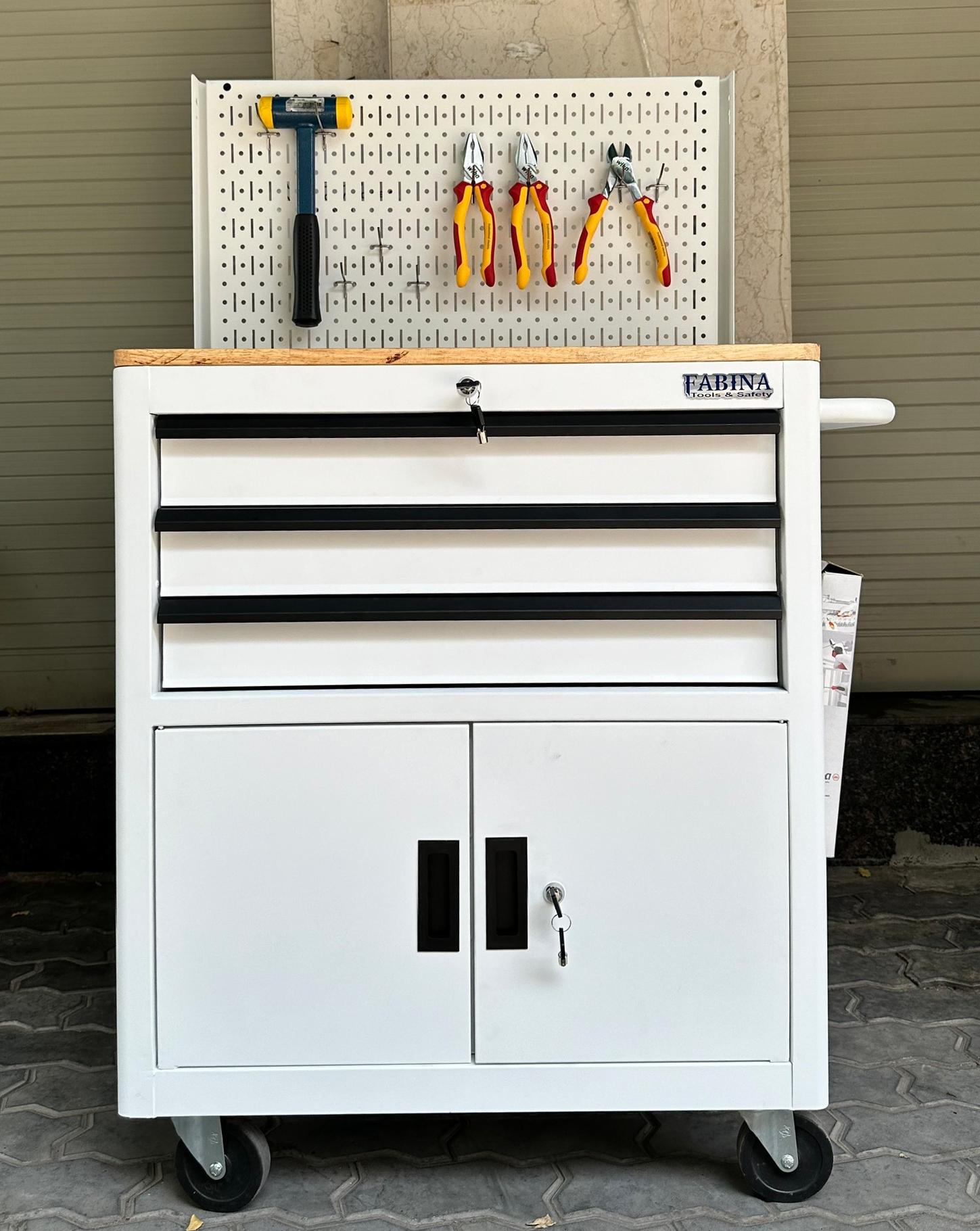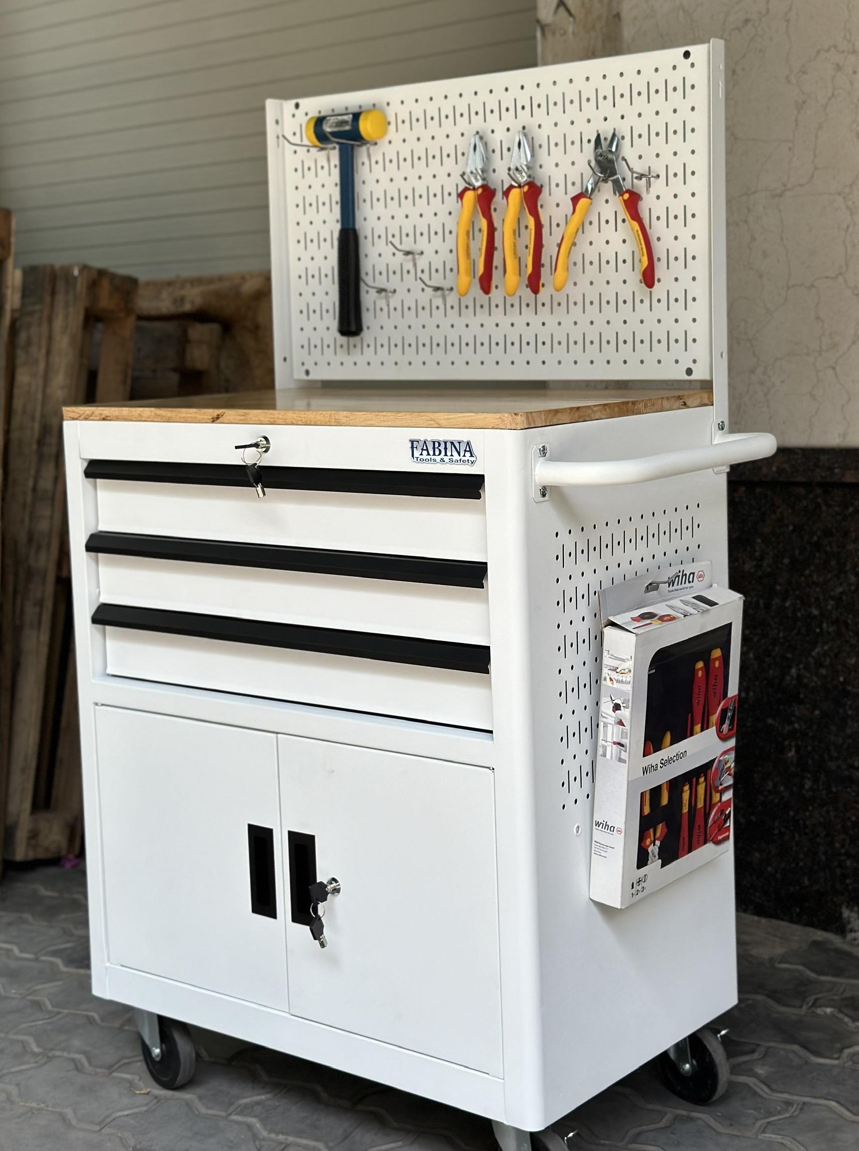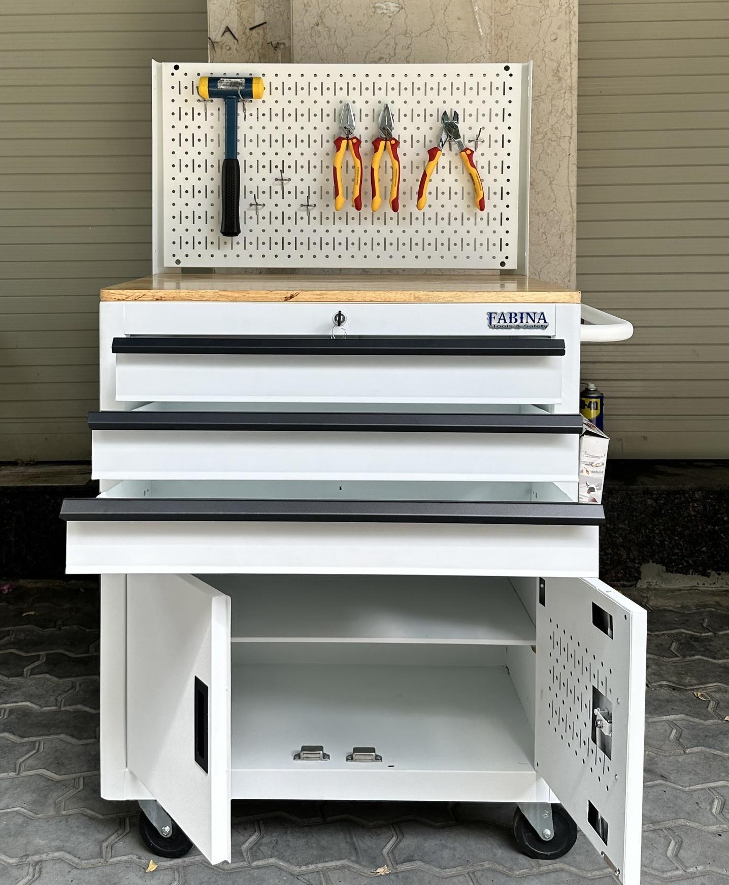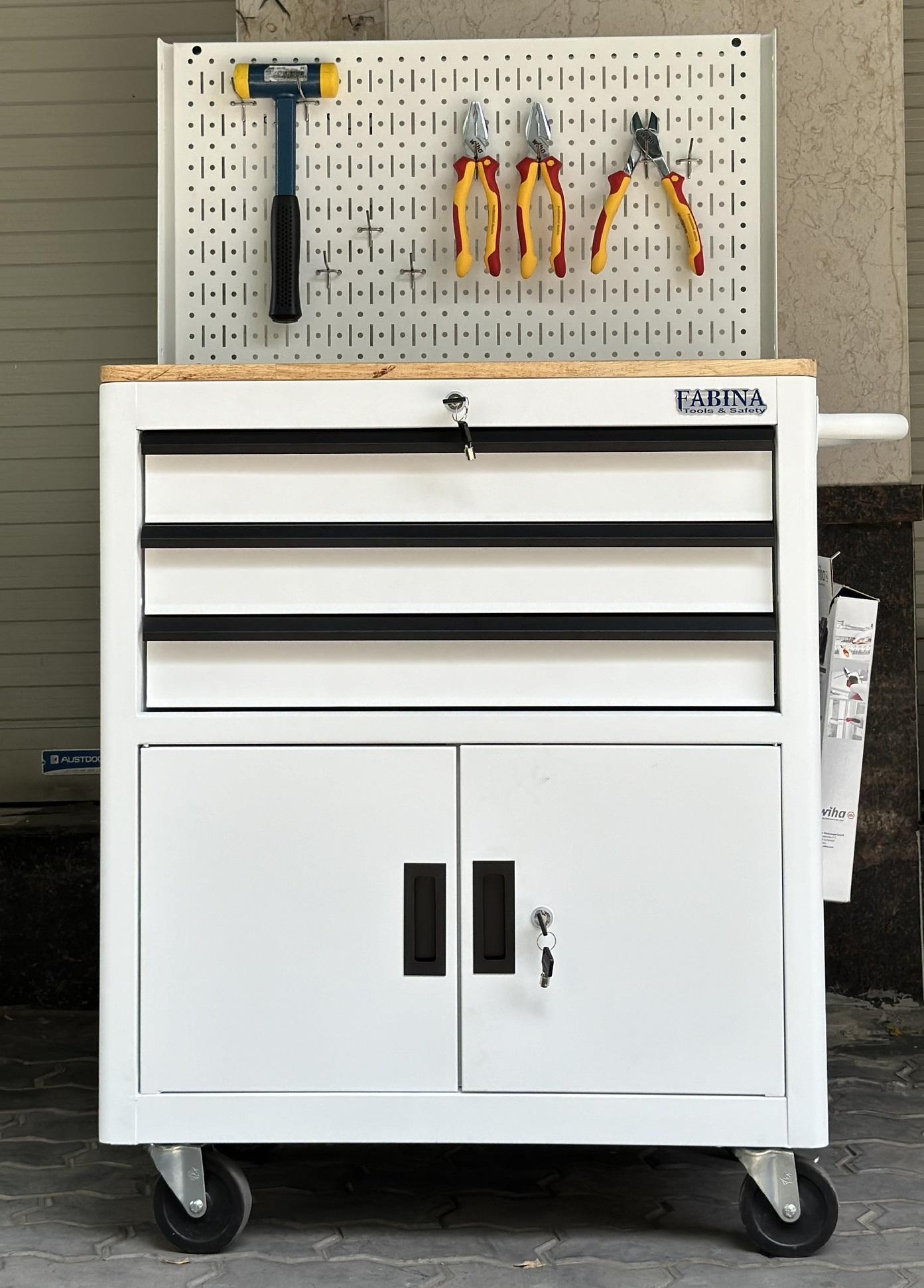 Tủ dụng cụ 3 hộc kéo 2 ngăn chứa màu trắng kèm vách lưới Fabina