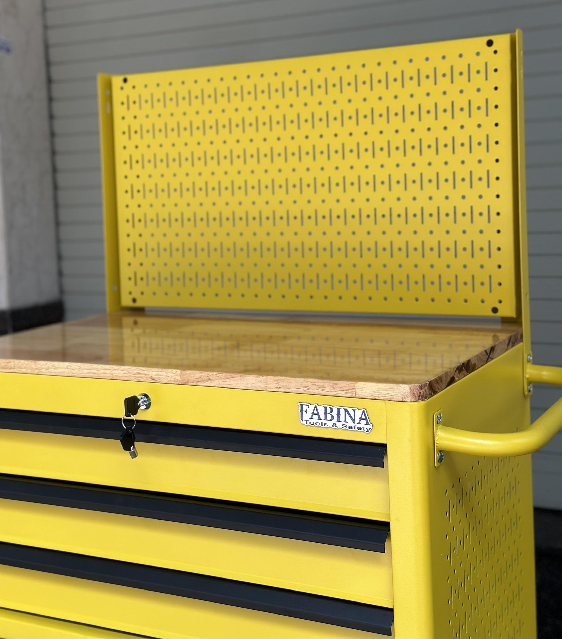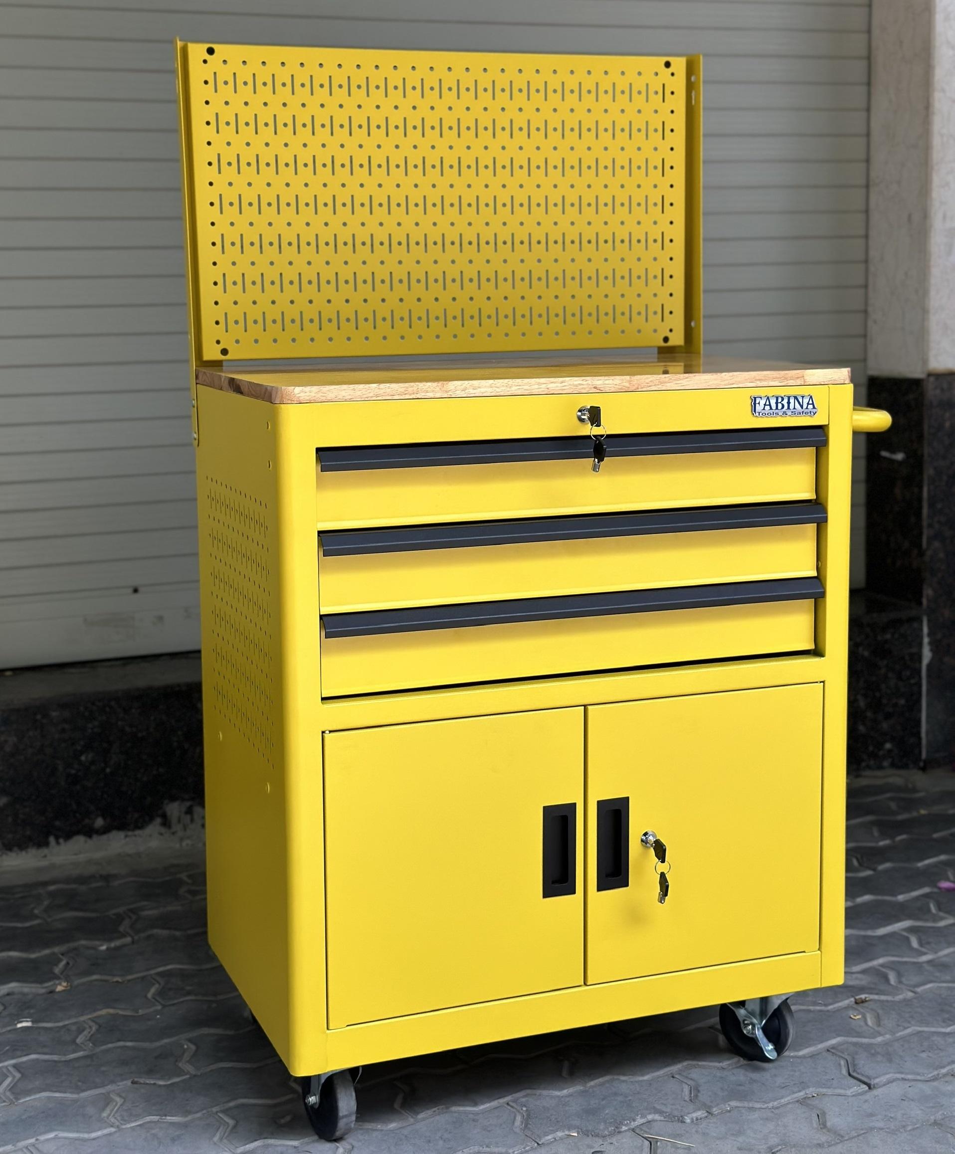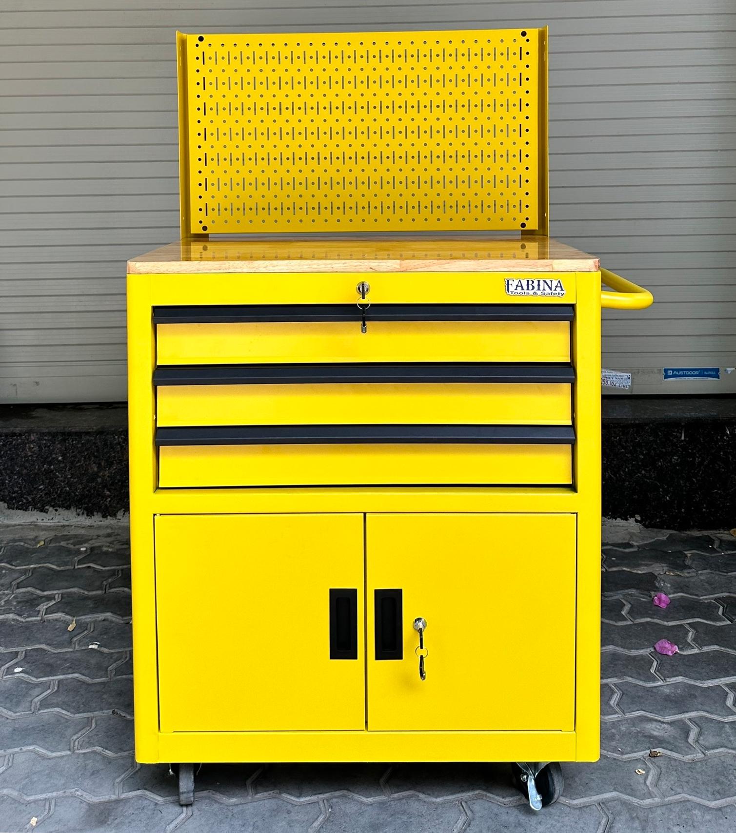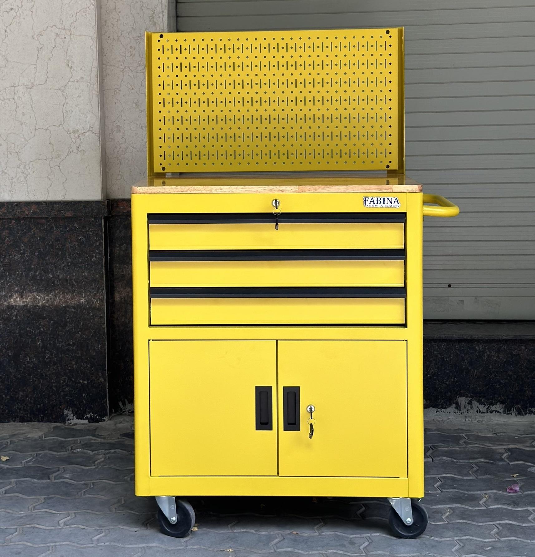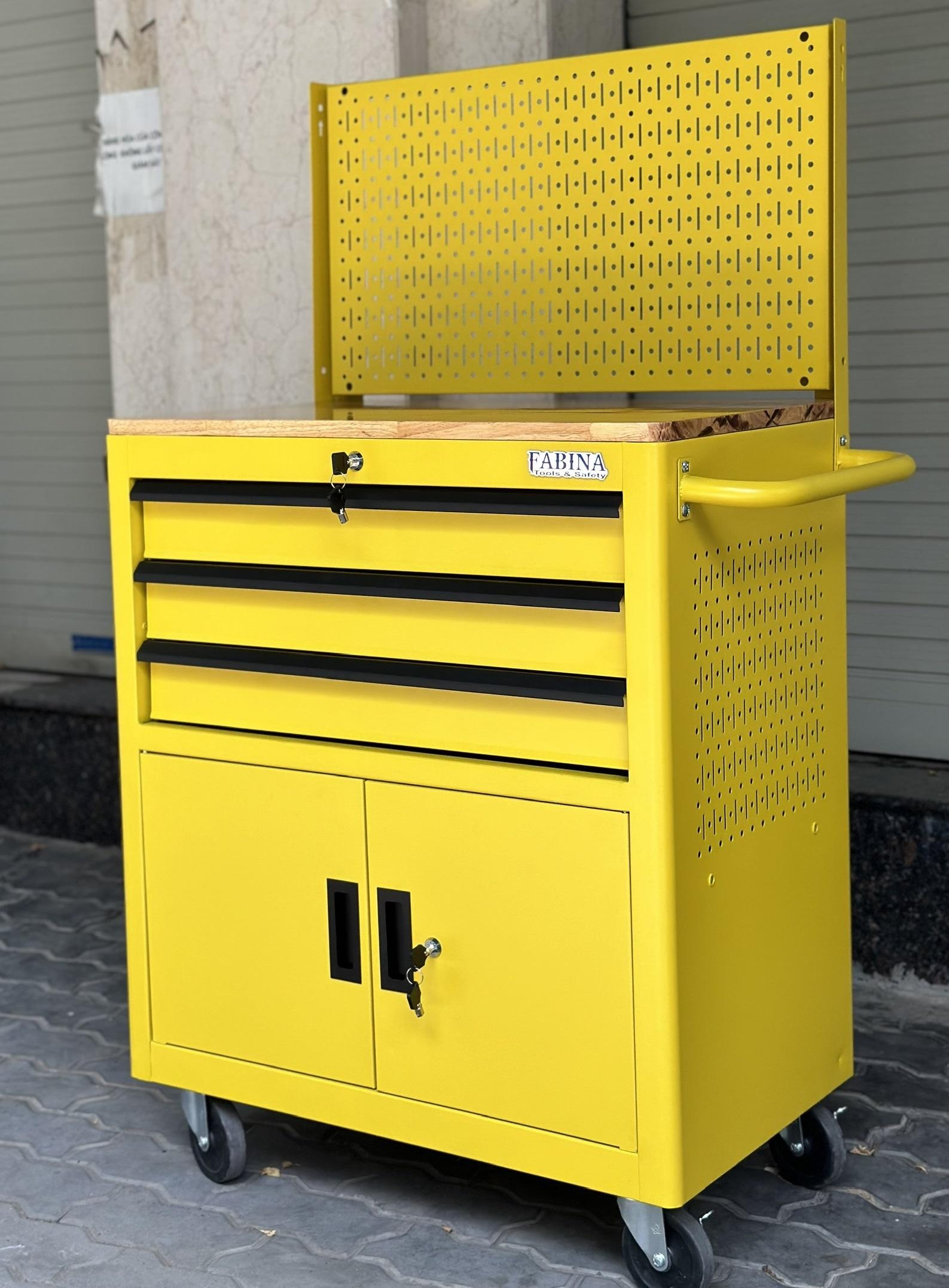Tủ dụng cụ 3 hộc kéo 2 ngăn chứa màu vàng kèm vách lưới Fabina