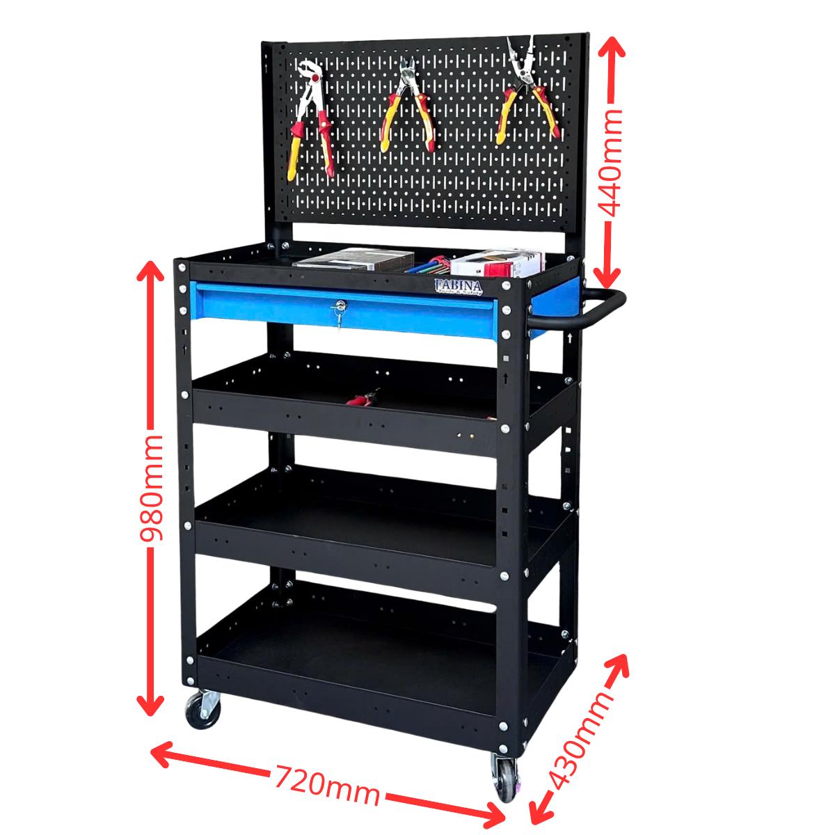 Xe đẩy 4 tầng cao 980mm màu đen hộc kéo xanh dương kèm vách lưới