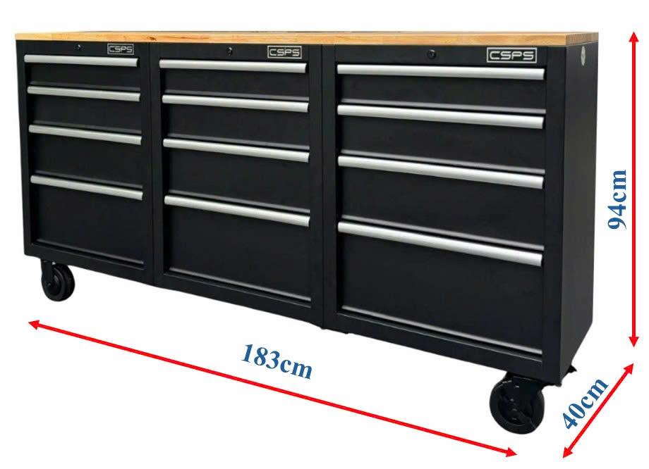 Set of 3 CSPS 183cm black tool cabinets with wooden panel - 12 drawers (white handle)