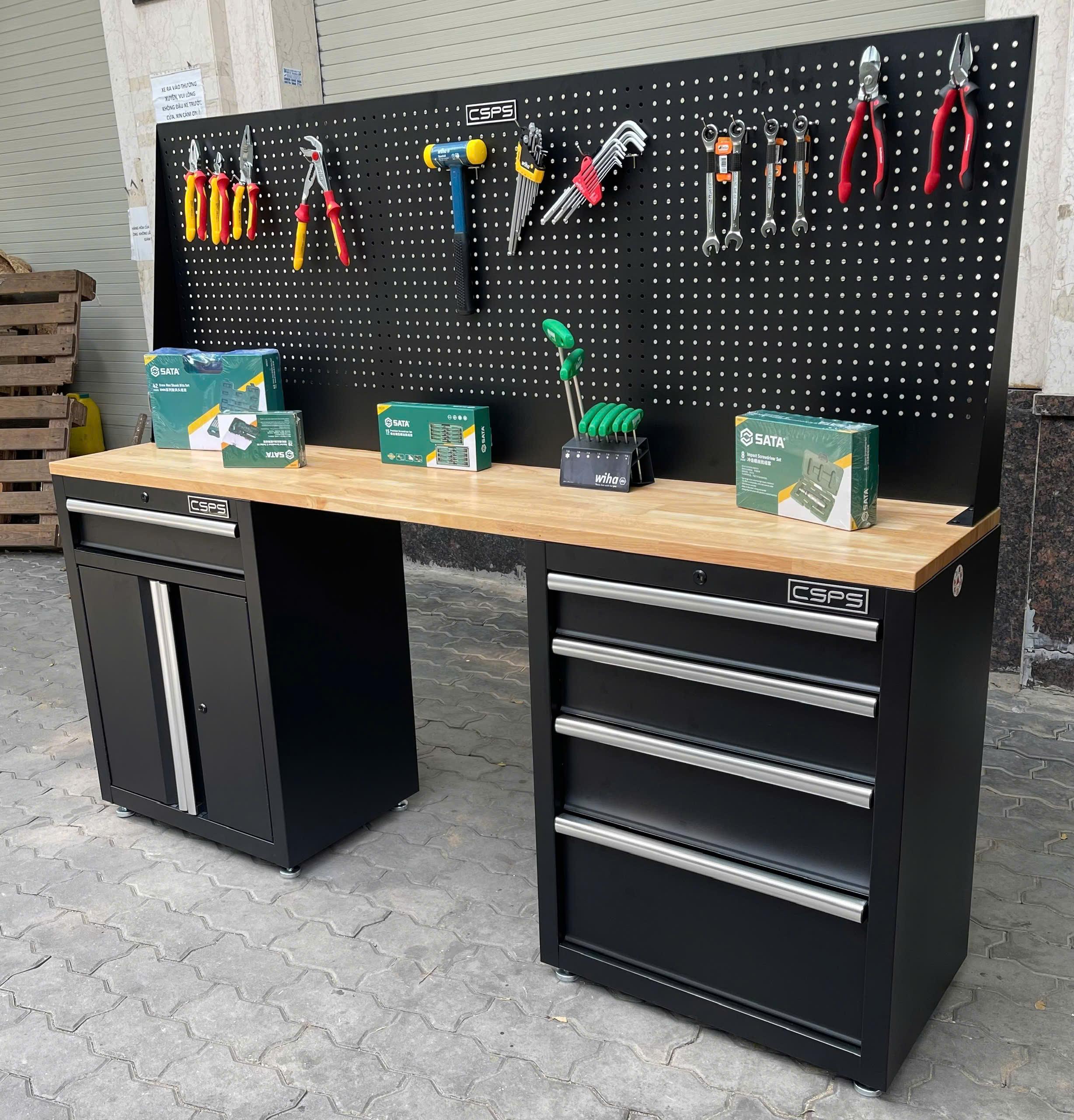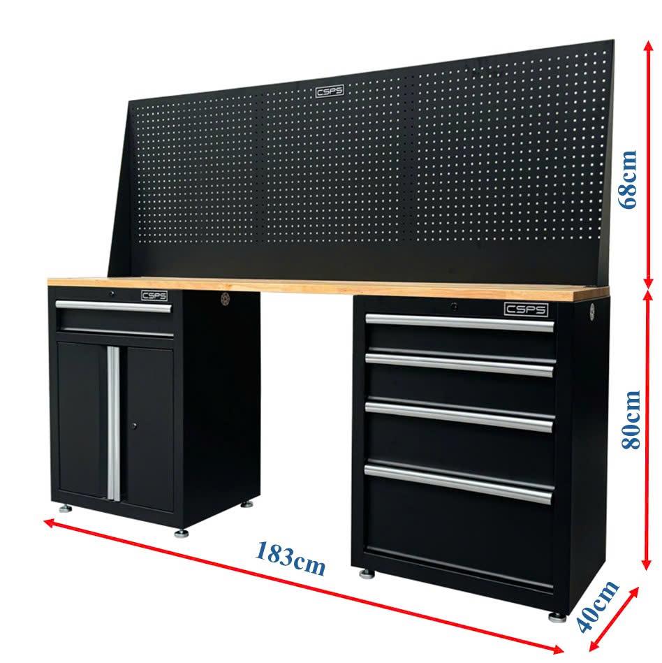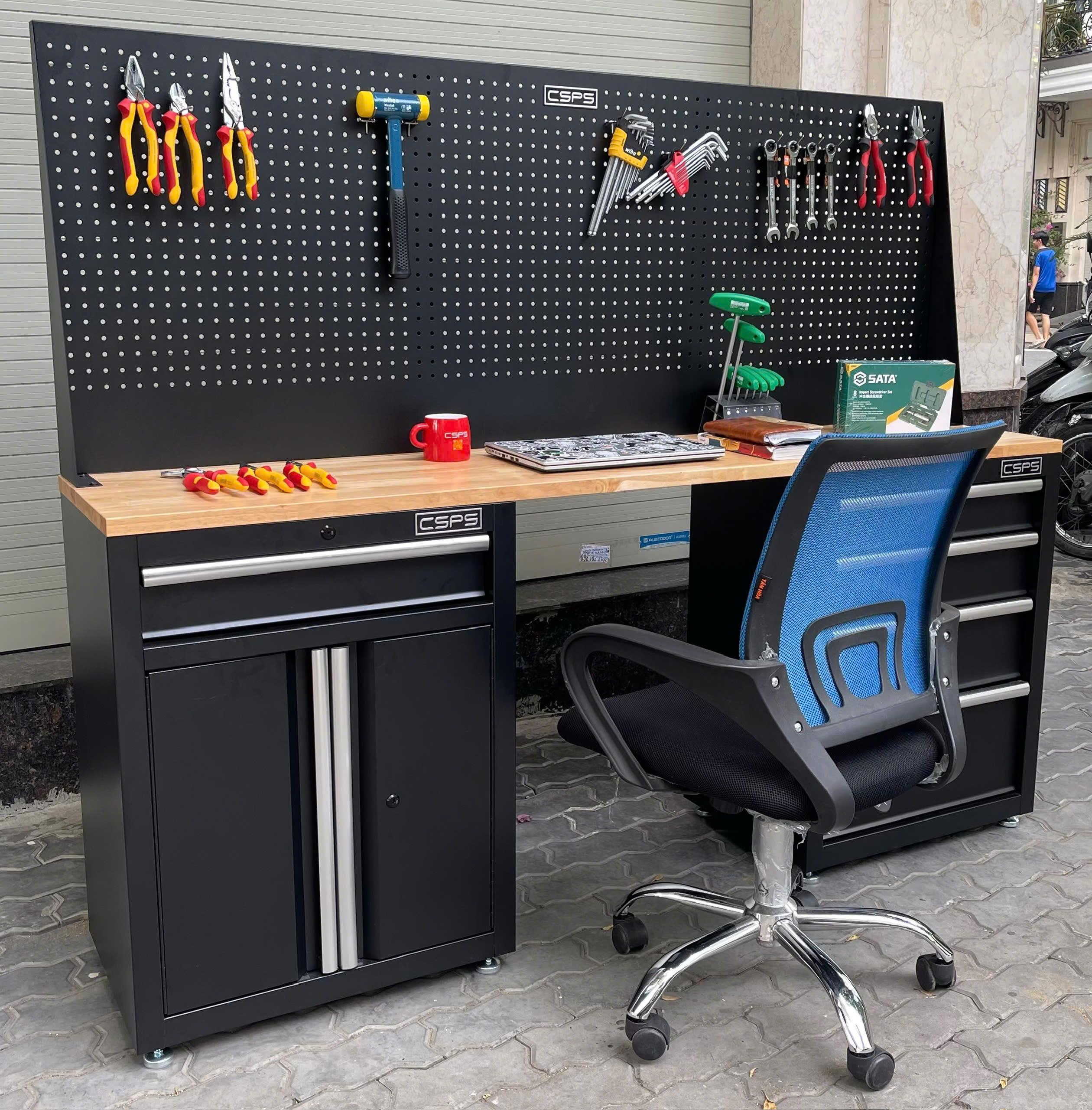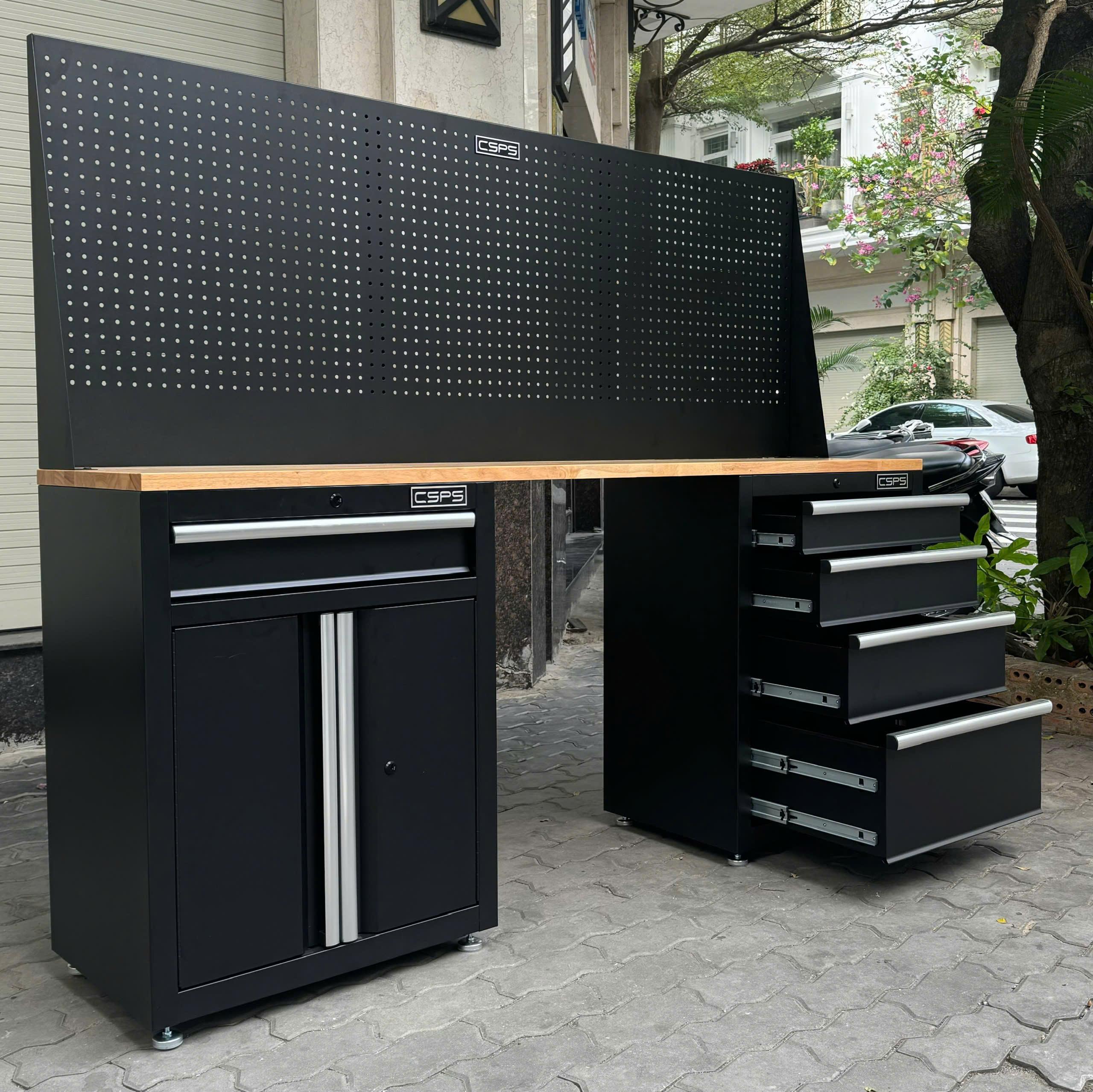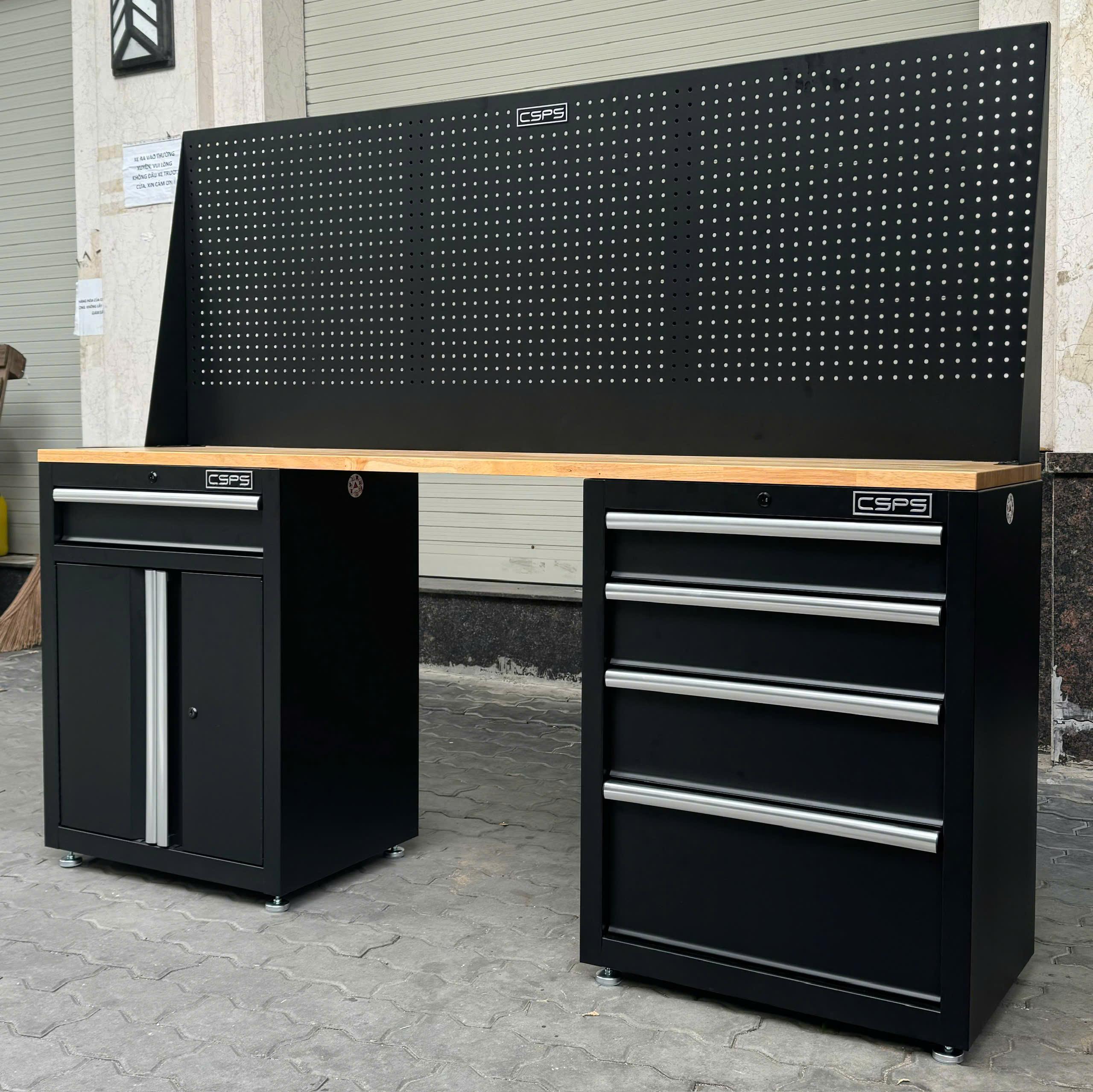 Bộ Bàn Nguội CSPS 183cm - 05 hộc kéo màu đen mặt ván gỗ vách lưới kèm chân tăng chỉnh (tay cầm trắng)