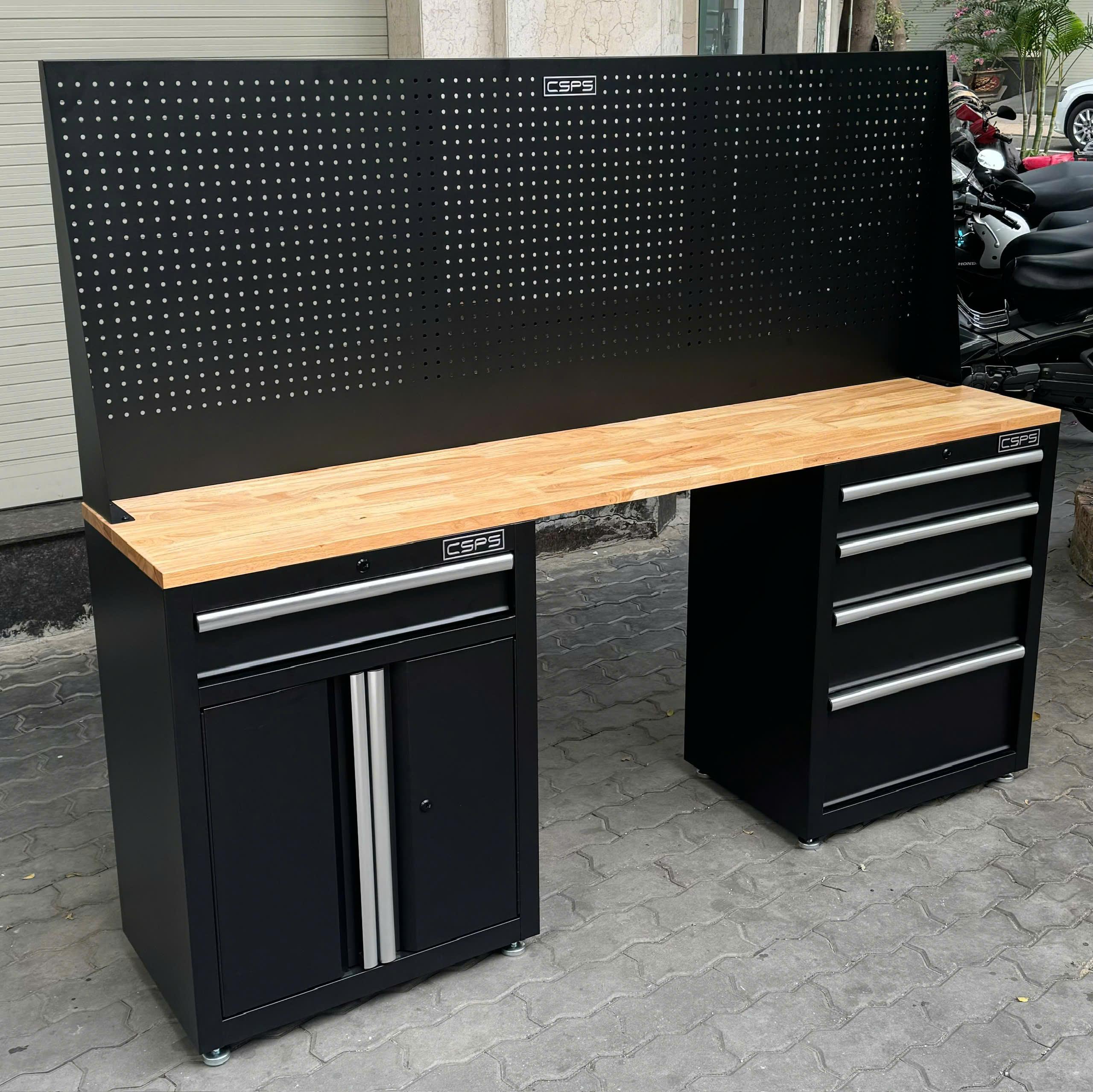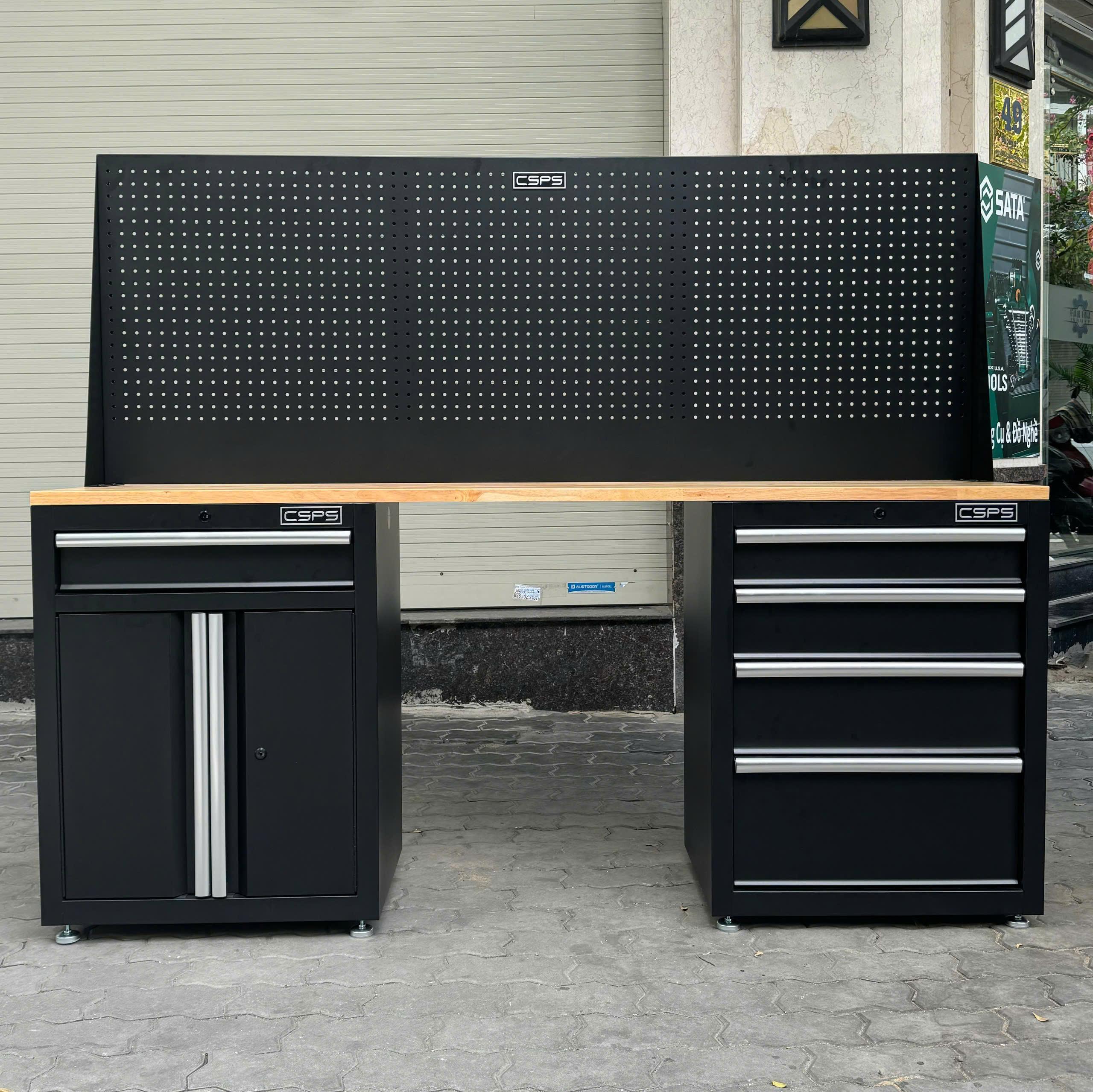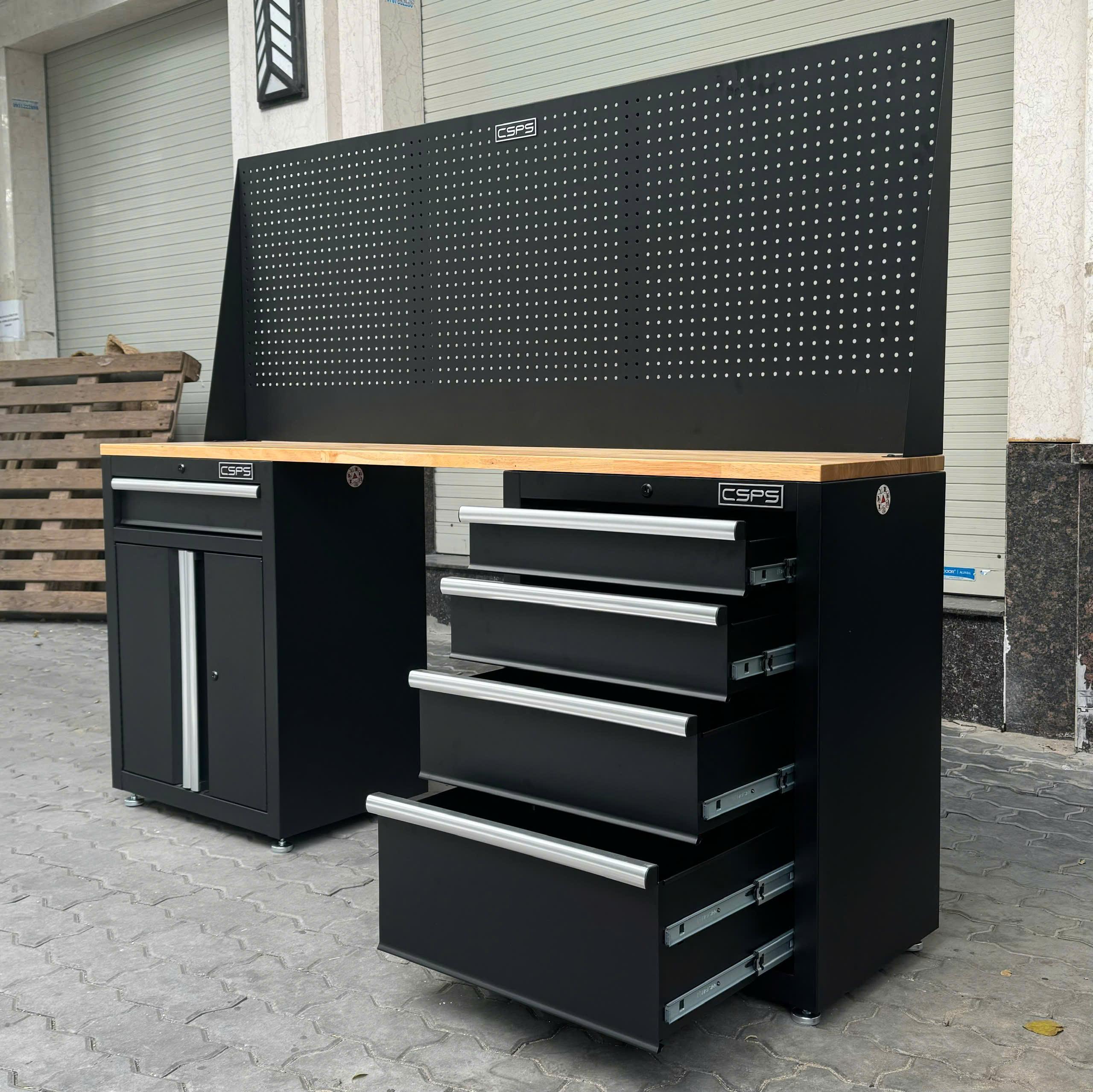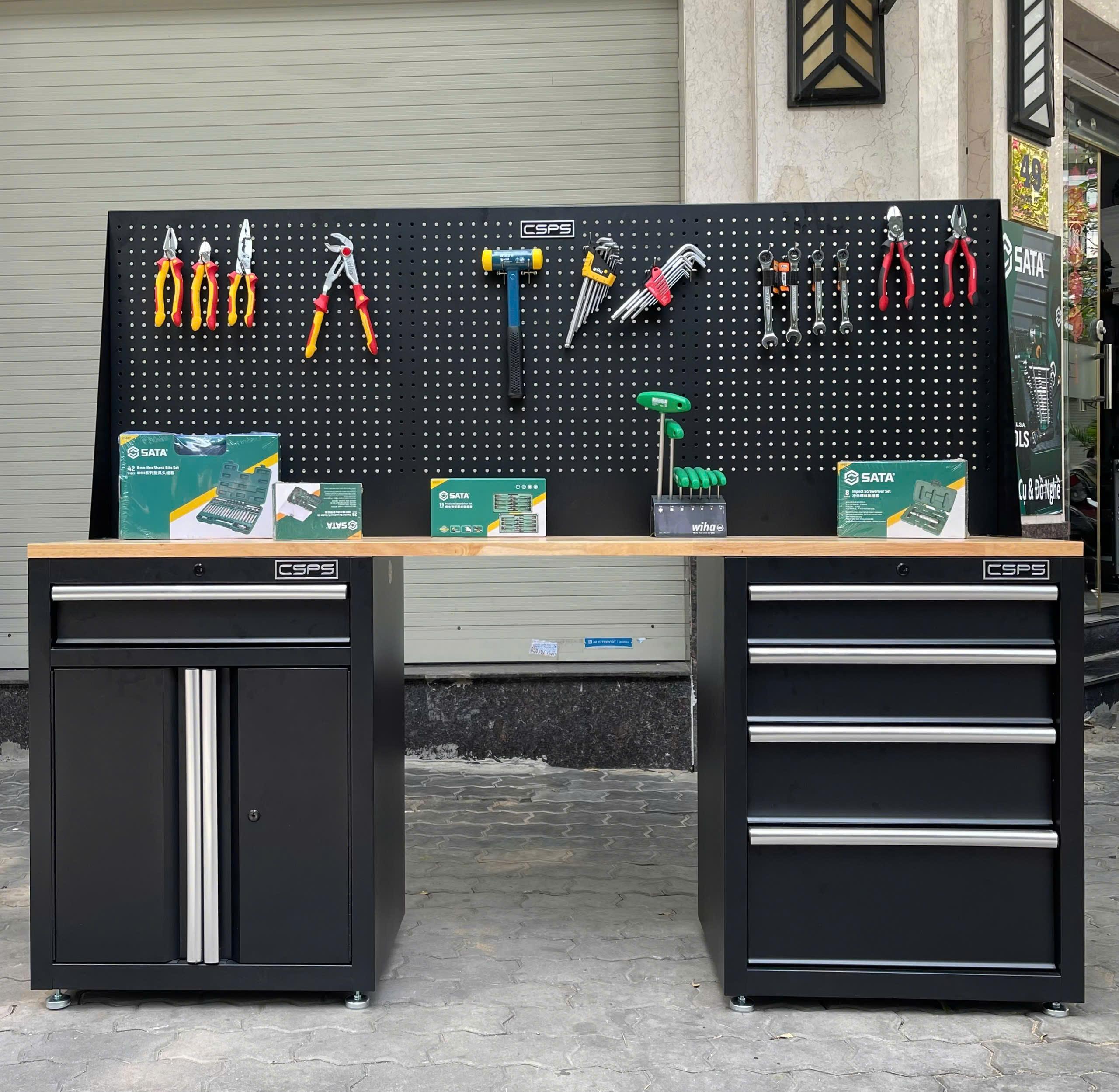 Bộ Bàn Nguội CSPS 183cm - 05 hộc kéo màu đen mặt ván gỗ vách lưới kèm chân tăng chỉnh (tay cầm trắng)