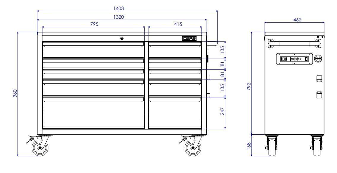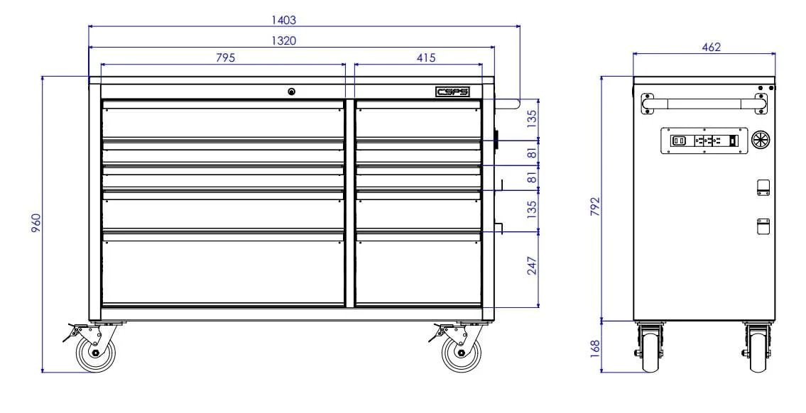 Tủ đồ nghề, tủ dụng cụ CSPS 132cm – 10 hộc kéo. Chứa dụng cụ, đồ nghề, văn phòng phẩm. Tủ di động, phù hợp với nhà máy, garage, cửa hàng, văn phòng. Bảo hành 02 năm. Tiêu chuẩn Mỹ. Sản phẩm của CSPS. Ray trượt bi. Sơn tĩnh điện.