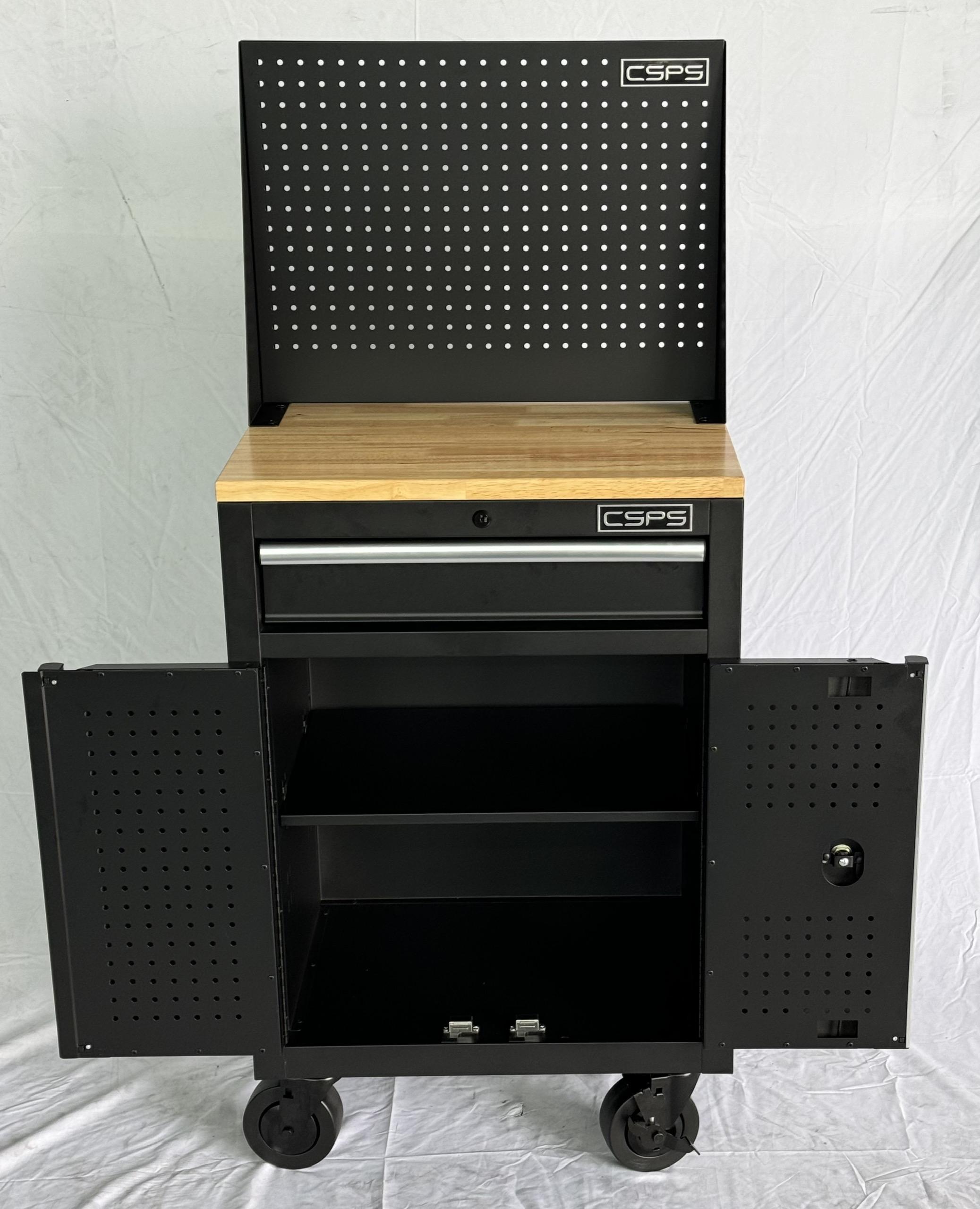 Tủ dụng cụ CSPS 61cm - 01 hộc kéo màu đen bánh xe ván gỗ vách lưới (tay cầm trắng)
