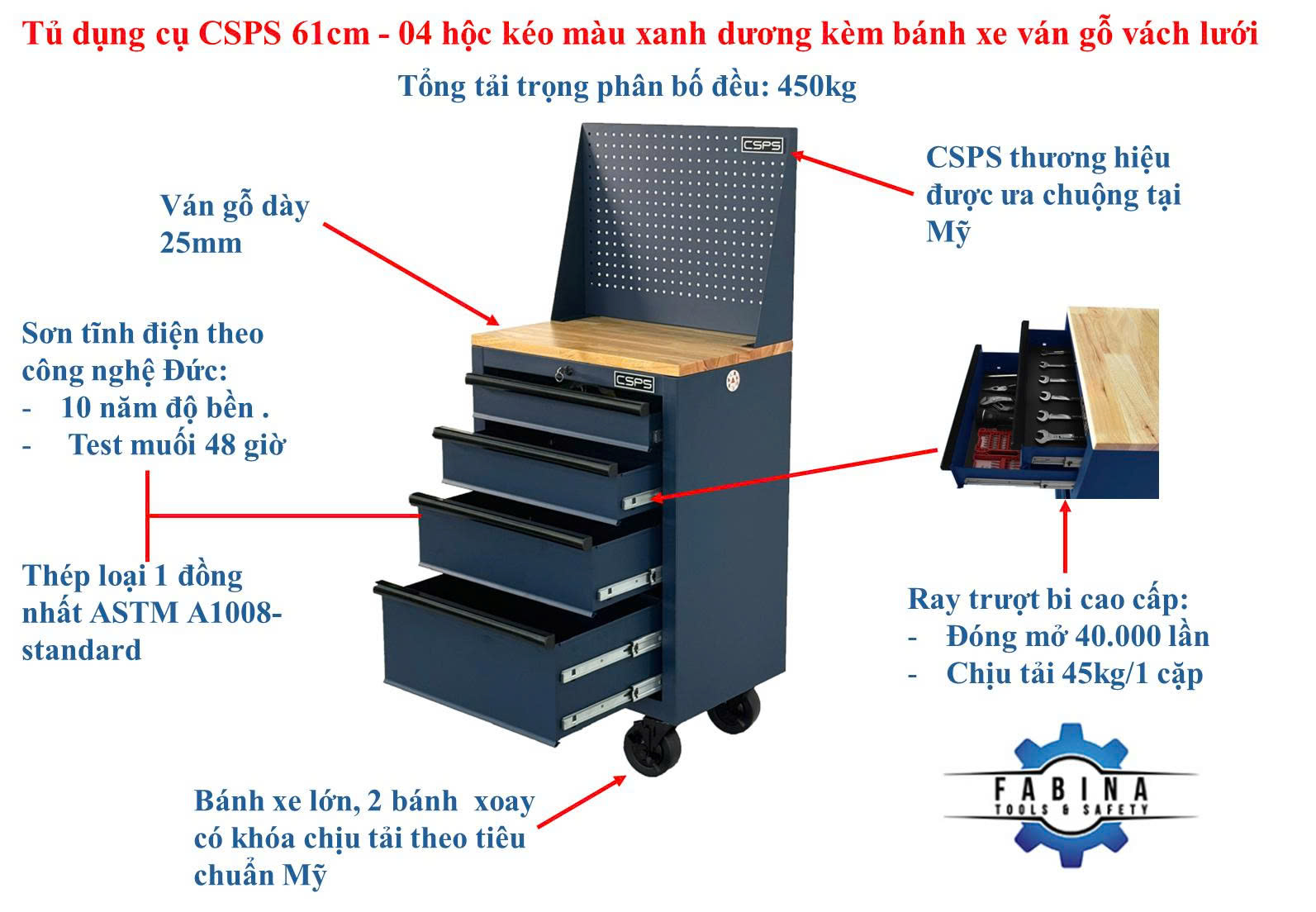 Tủ dụng cụ CSPS 61cm - 04 hộc kéo màu xanh dương kèm bánh xe ván gỗ vách lưới