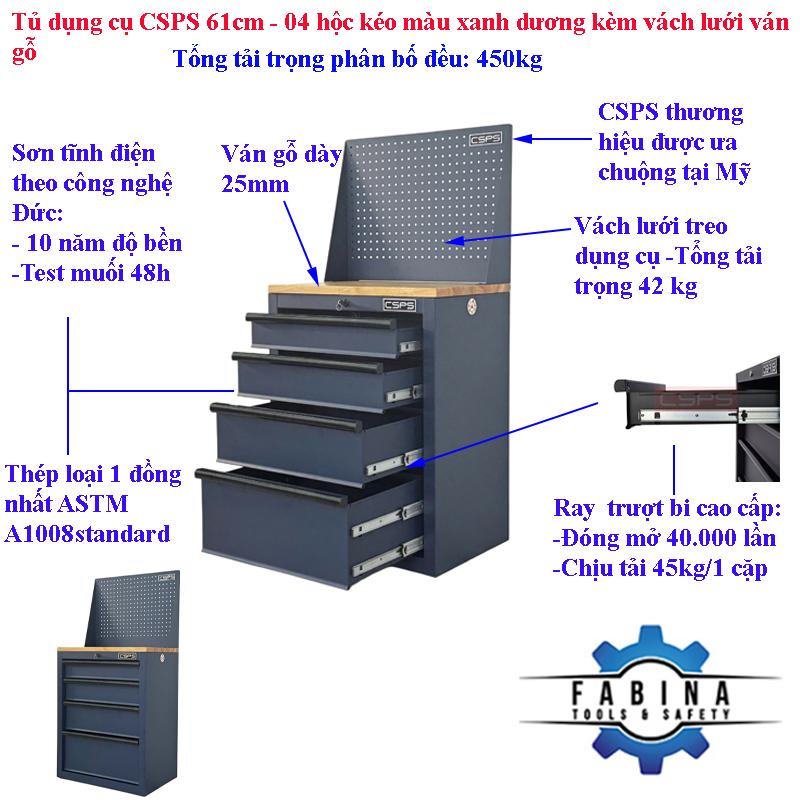 Tủ dụng cụ CSPS 61cm - 04 hộc kéo màu xanh dương kèm vách lưới ván gỗ