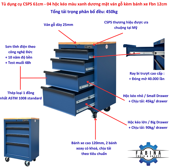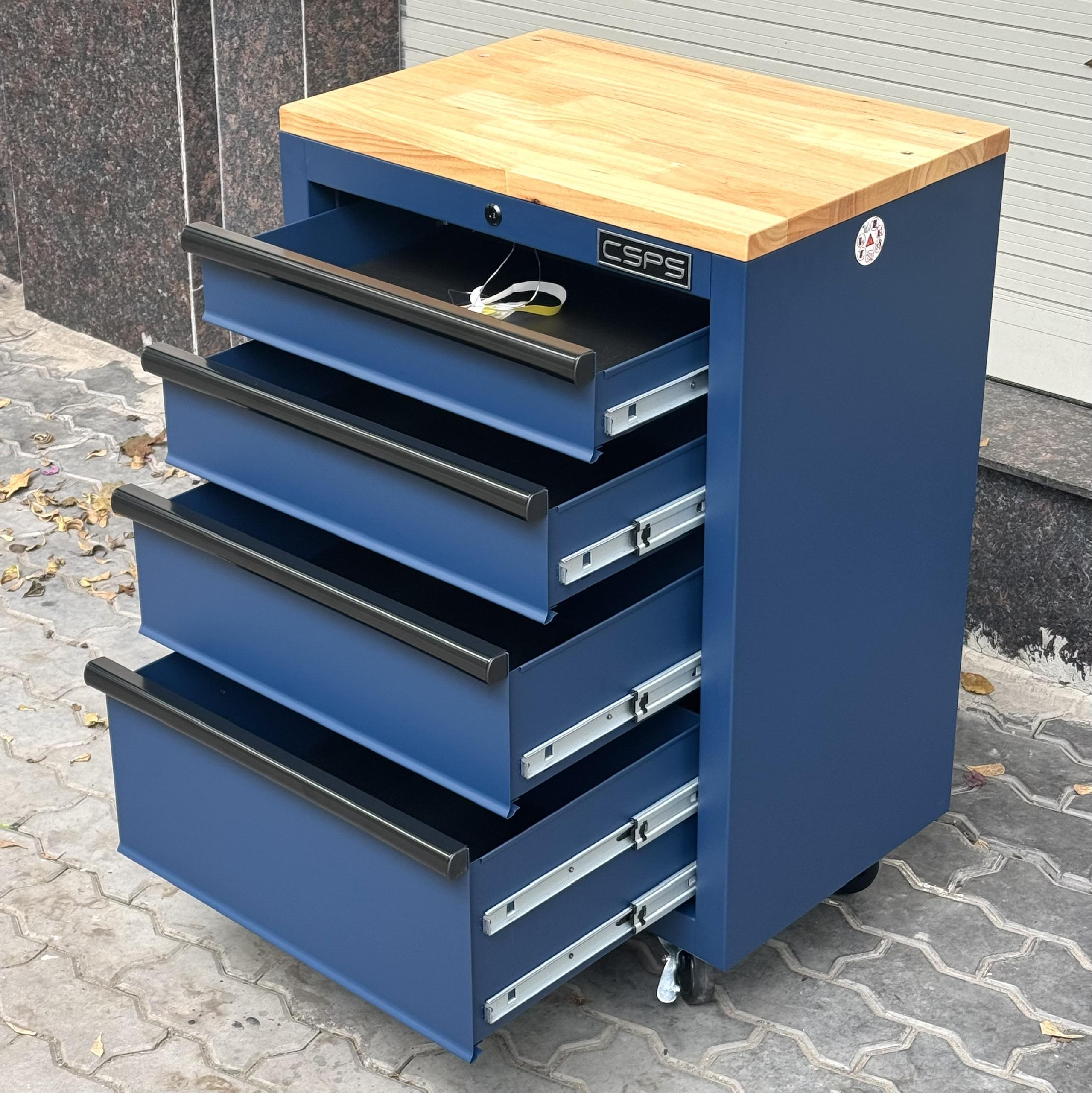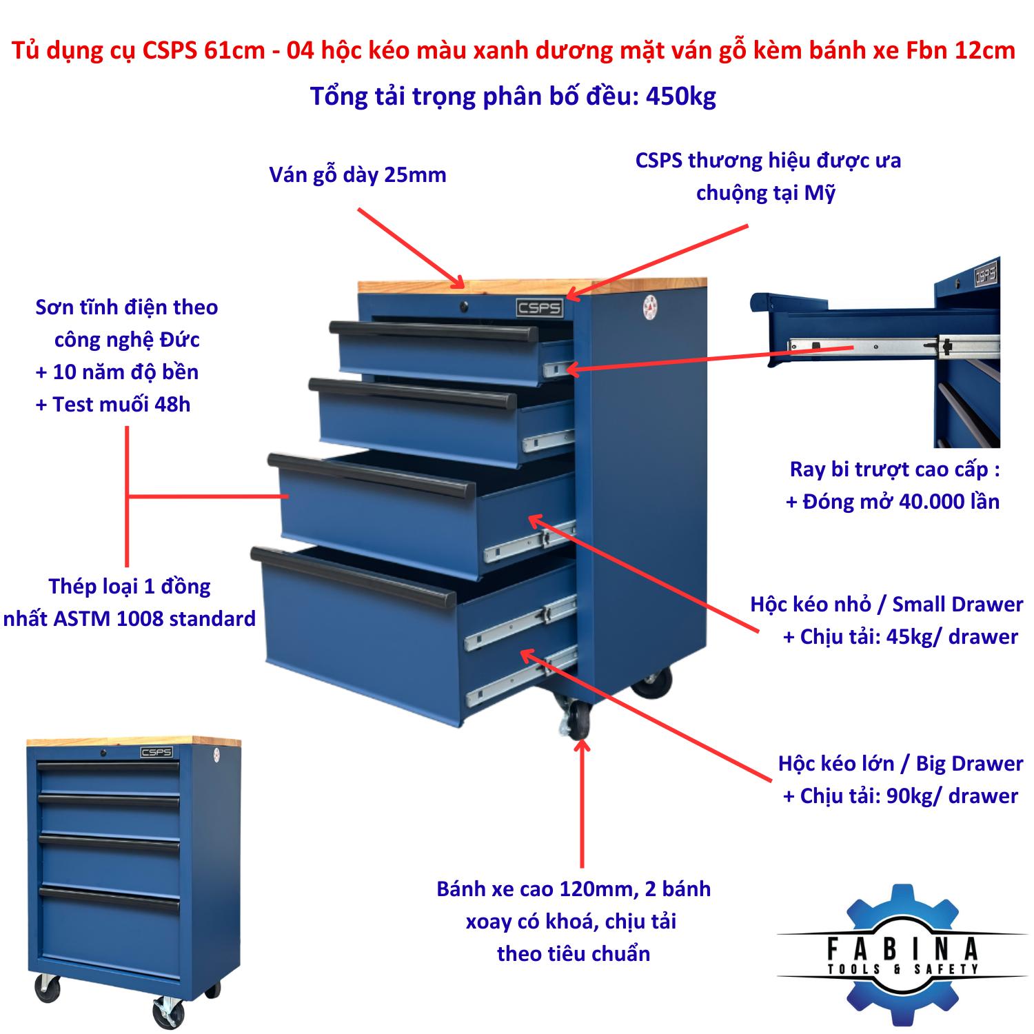 Tủ dụng cụ CSPS 61cm - 04 hộc kéo màu xanh dương mặt ván gỗ kèm bánh xe Fbn 12cm