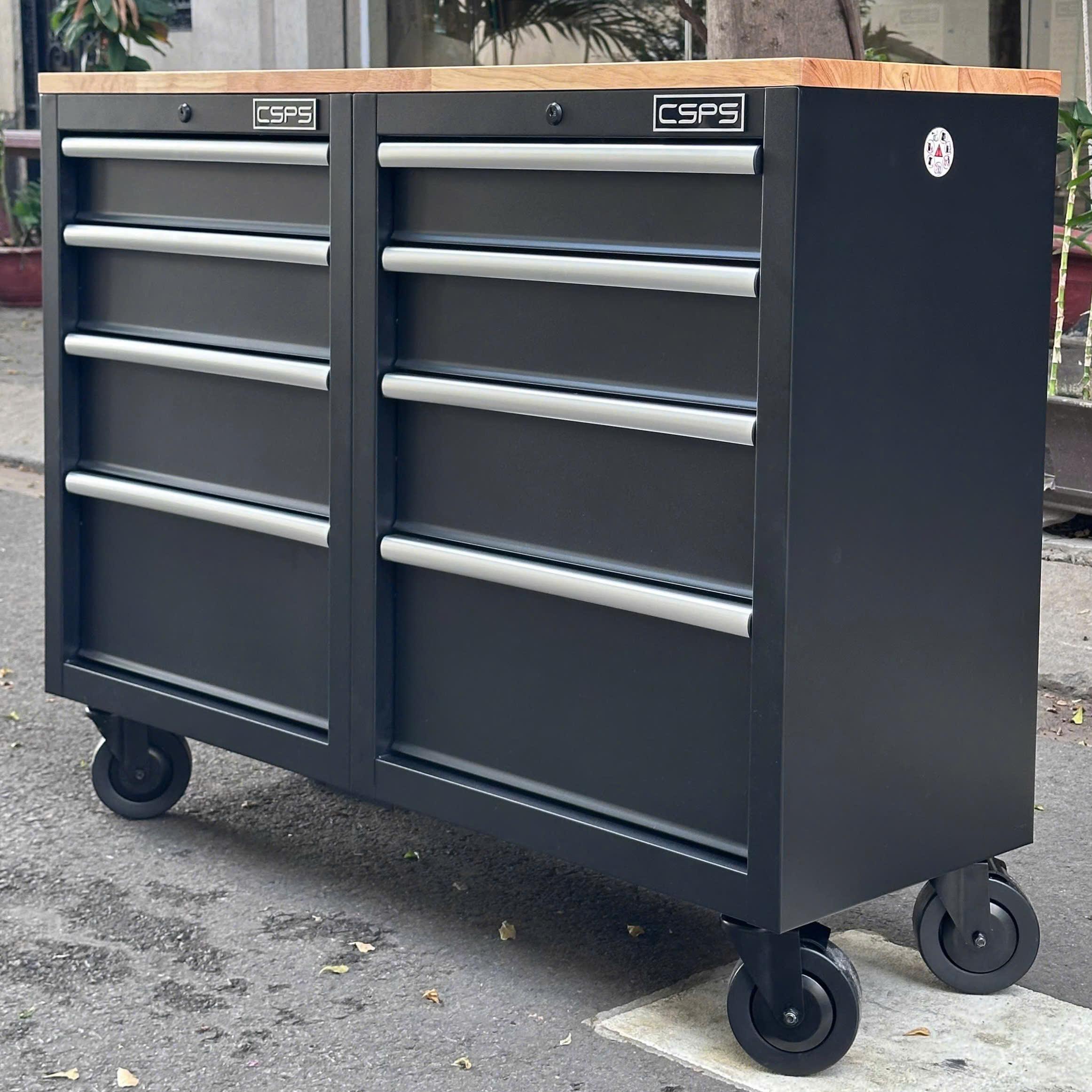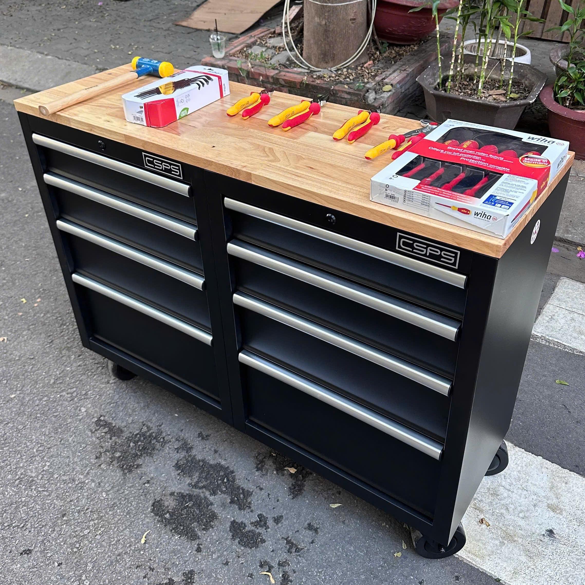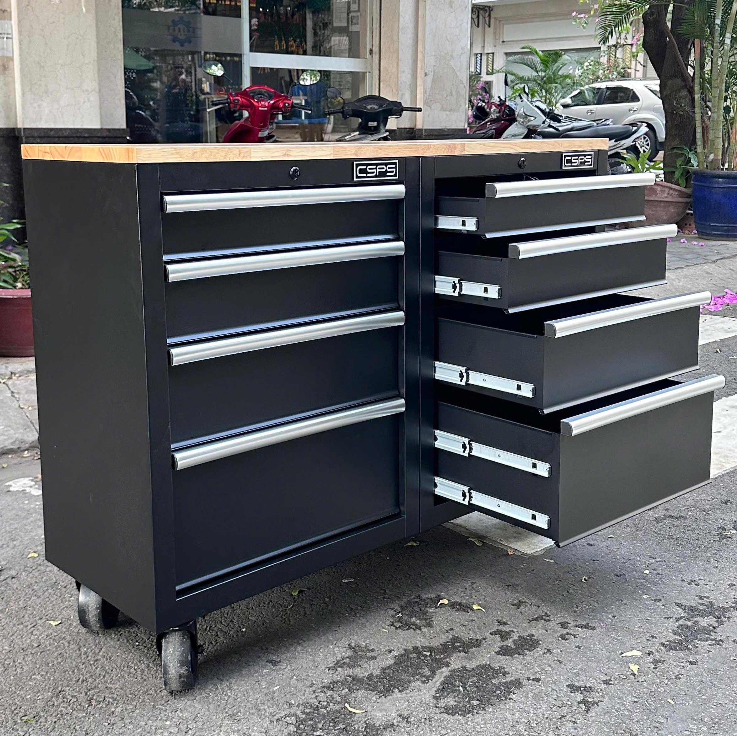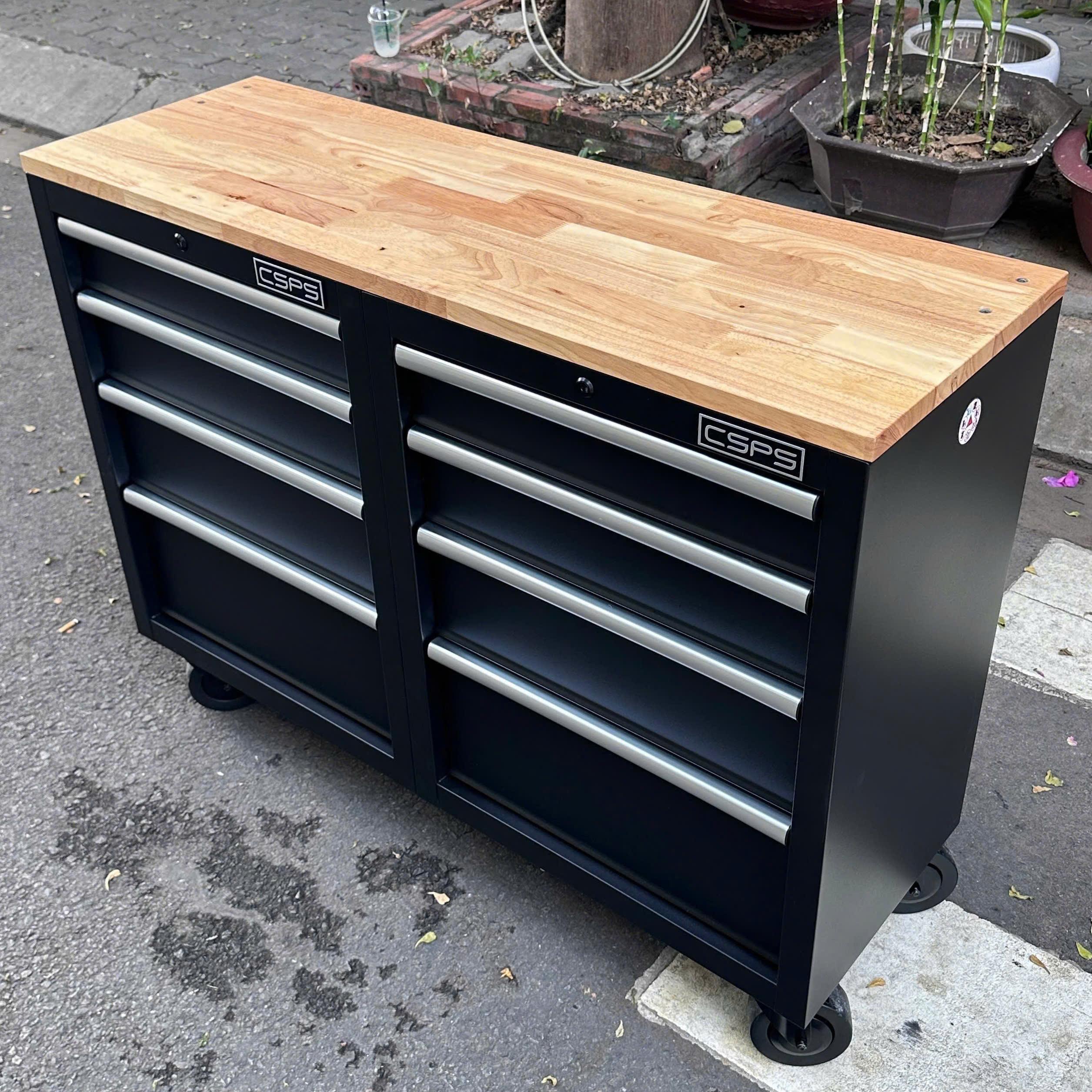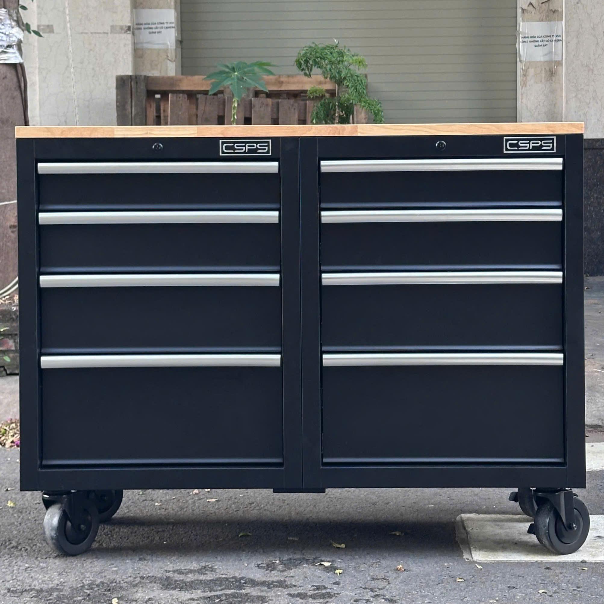Tủ dụng cụ CSPS 122cm - 08 hộc kéo màu đen tay cầm trắng mặt ván gỗ