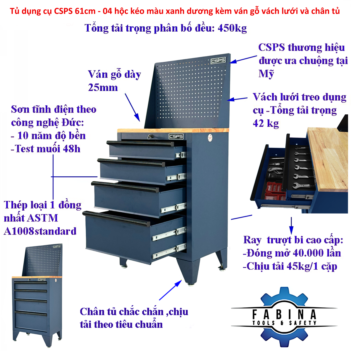 Tủ dụng cụ CSPS 61cm - 04 hộc kéo màu xanh dương kèm ván gỗ vách lưới và chân tủ