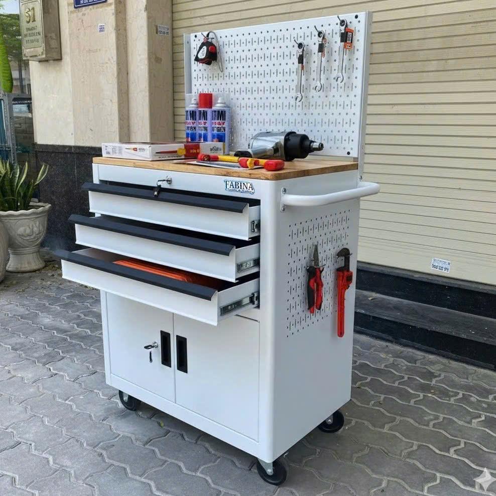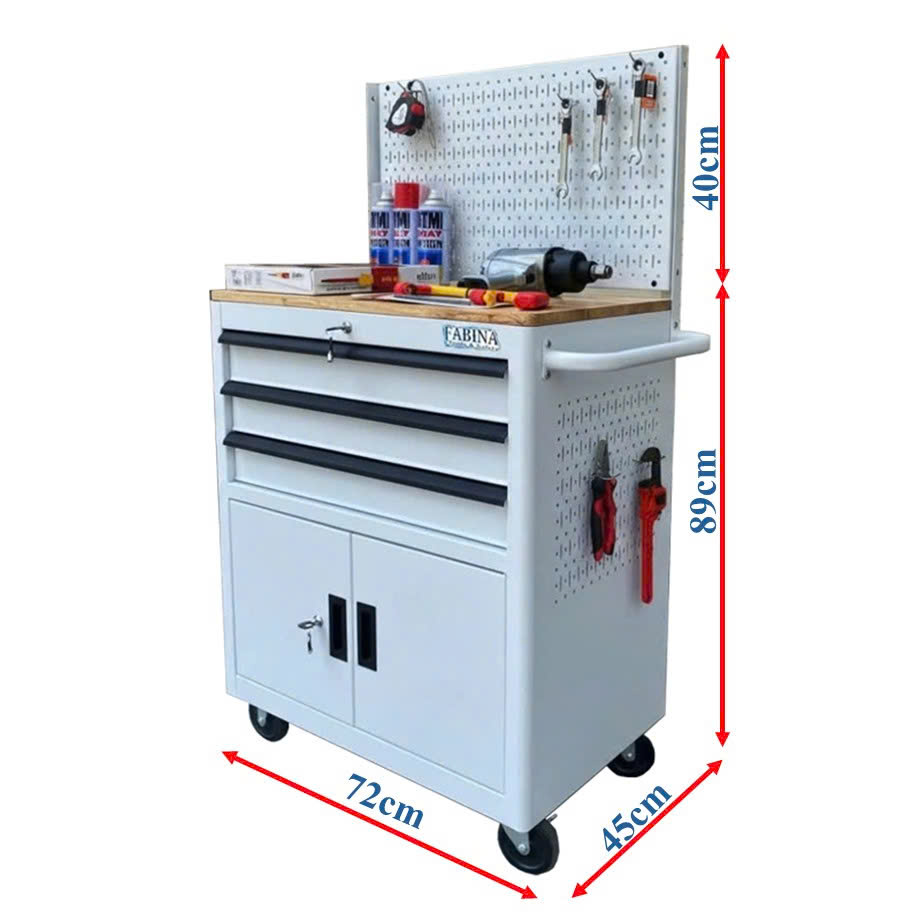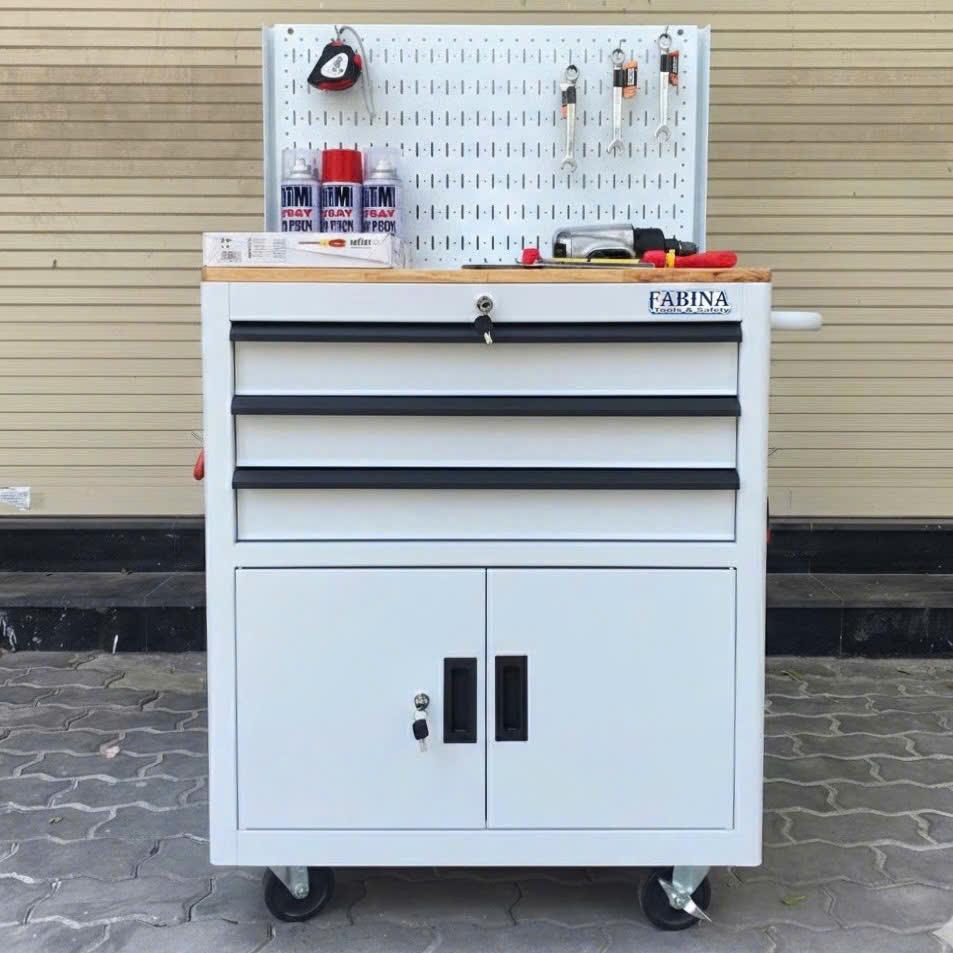 Tủ dụng cụ 3 hộc kéo 2 ngăn chứa màu trắng kèm vách lưới Fabina