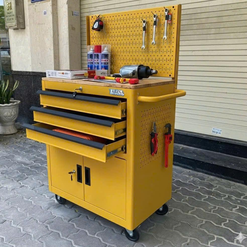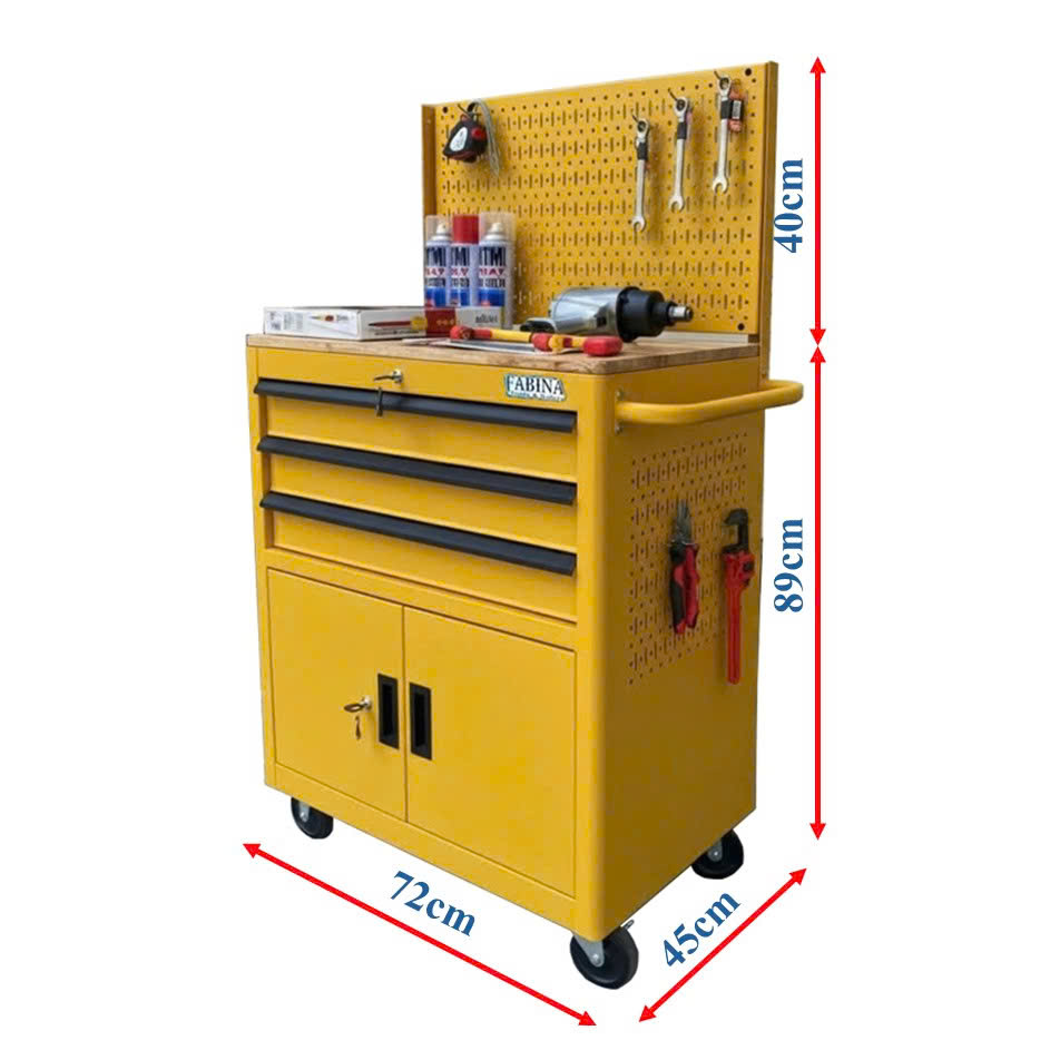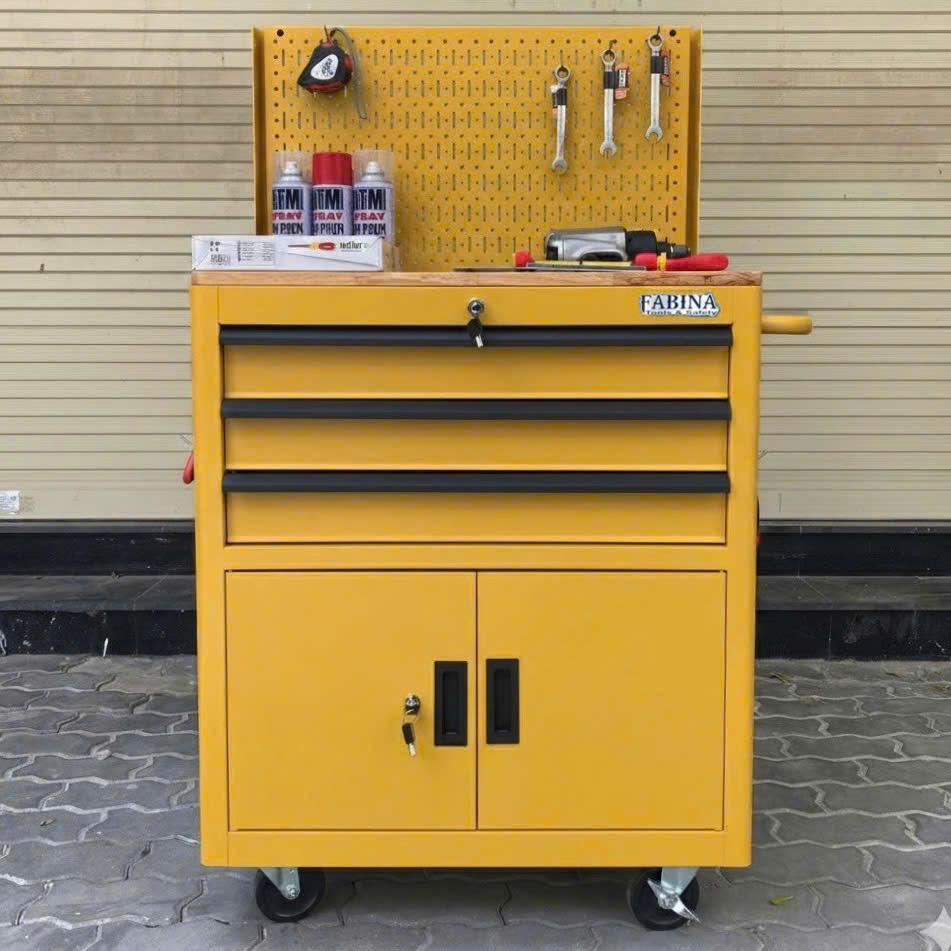 Tủ dụng cụ 3 hộc kéo 2 ngăn chứa màu vàng kèm vách lưới Fabina